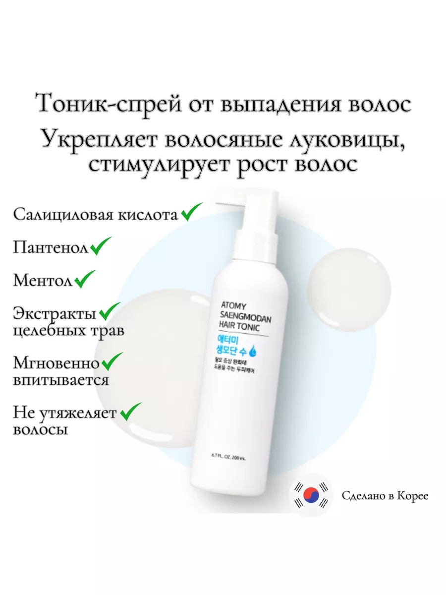Тоник-спрей против выпадения волос от корейской компании Atomy. Уникальный состав средства, включающий в себя экстракты трав, ментол и салициловую кислоту, разработан специально для предотвращения выпадения волос, укрепления волосяных луковиц, укрепления структуры волос.
