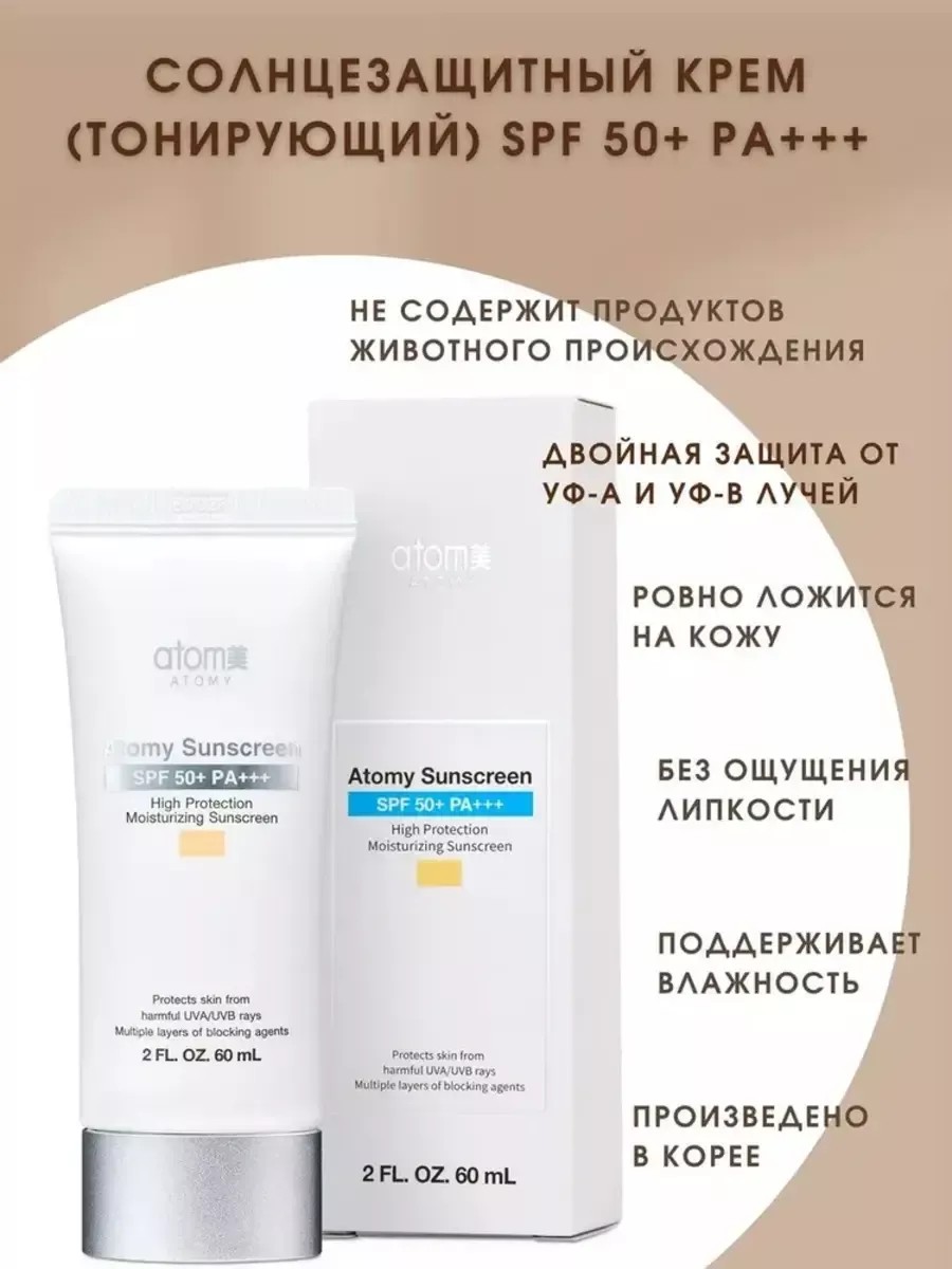 Солнцезащитный тональный крем Atomy (Южная Корея) SPF 50+ PA+++ (бежевый)-60 мл-Легкий и осветляющий солнцезащитный крем не забивает поры и имеет приятный аромат. Очень легкий, едва заметный, устойчив к кожным выделениям и поту. Нанесите средство на лицо и области вокруг шеи на заключительном этапе ухода. Используйте крем непосредственно перед выходом на солнце. Преимущества солнцезащитного крема Atomy SPF50+:Мощная УФ-защита гарантирована. Пользователи получают возможность защитить кожу от вредного воздействия УФА- И УФВ-излучения солнечных лучей, чтобы в целом сохранить красивую и здоровую кожу. Двойная защита от УФ-А и УФ-В улучшает текстуру кожи. Блокирует все внешние загрязнители с эффектом двойной фильтрации. Он абсолютно мягкий в использовании, так как при изготовлении солнцезащитного крема Atomy SPF50+ нет агрессивных ингредиентов. Солнцезащитный тональный крем Атоми выранивает тон, защищает кожу от солнца, подстраивается к цвету и текстуре кожи. Будьте всегда красивыми и любите себя с корейской косметикой от Atomy.