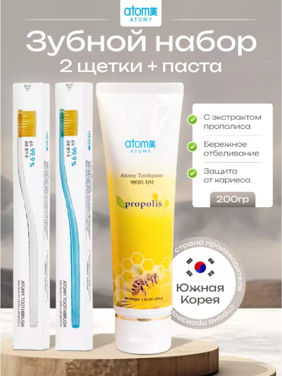 | Комплектация | Зубной набор Атоми ( паста 200 гр с 2-мя щётками) |