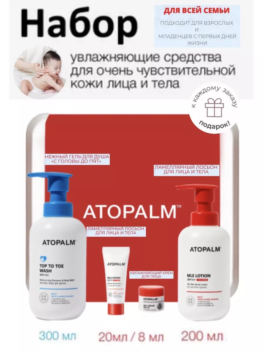 ATOPALM Essential Care Set of Moisturizing Products for Adult and Children's Skin. This set of soothing face and body products with a lamellar emulsion is ideal for dry and sensitive skin. These products can even be used for dermatitis and eczema. The multilamellar emulsion will restore the skin and strengthen its protective barrier. The ingredients are suitable for the sensitive skin of both adults and children. All products in the set are dermatologist-tested and free of harmful ingredients. The base of these products is the patented MLE SKIN BARRIER FORMULA, a lamellar emulsion that the skin's protective barrier recognizes as its own. It enhances the skin's immunity to harmful environmental factors and improves the penetration of active ingredients. The set includes: 1) ATOPALM Lamellar Moisturizing Face Cream Atopalm MLE Cream 8 ml - this moisturizing cream significantly enhances the skin's protective functions, quickly restores the skin barrier, relieves irritation, itching, and redness. The product protects against the harmful effects of the environment. Suitable for all skin types. 2) ATOPALM Lamellar Lotion for Face and Body MLE Moisturizing Body Lotion 200 ml + 20 ml - ideal for moisturizing the face and body. The product fights dryness, flaking, and redness. Contains antioxidants and makes the skin soft and supple. Shea butter in the formula has a nourishing and softening effect. 3) ATOPALM Universal Children's Shower Gel Top to Toe Wash 300 ml - 2-in-1 shampoo-gel with five types of amino acids - a cleansing product containing ceramides and vegetable oils, which is suitable for bathing even the smallest. This product is ideal for delicate and sensitive skin—it doesn't dry out and maintains its healthy appearance thanks to its skin-friendly pH level. Its unique formula deeply moisturizes, soothes, and promotes cell strengthening. Suitable for all skin types, including those with dermatitis, atopy, and eczema. Hypoallergenic.