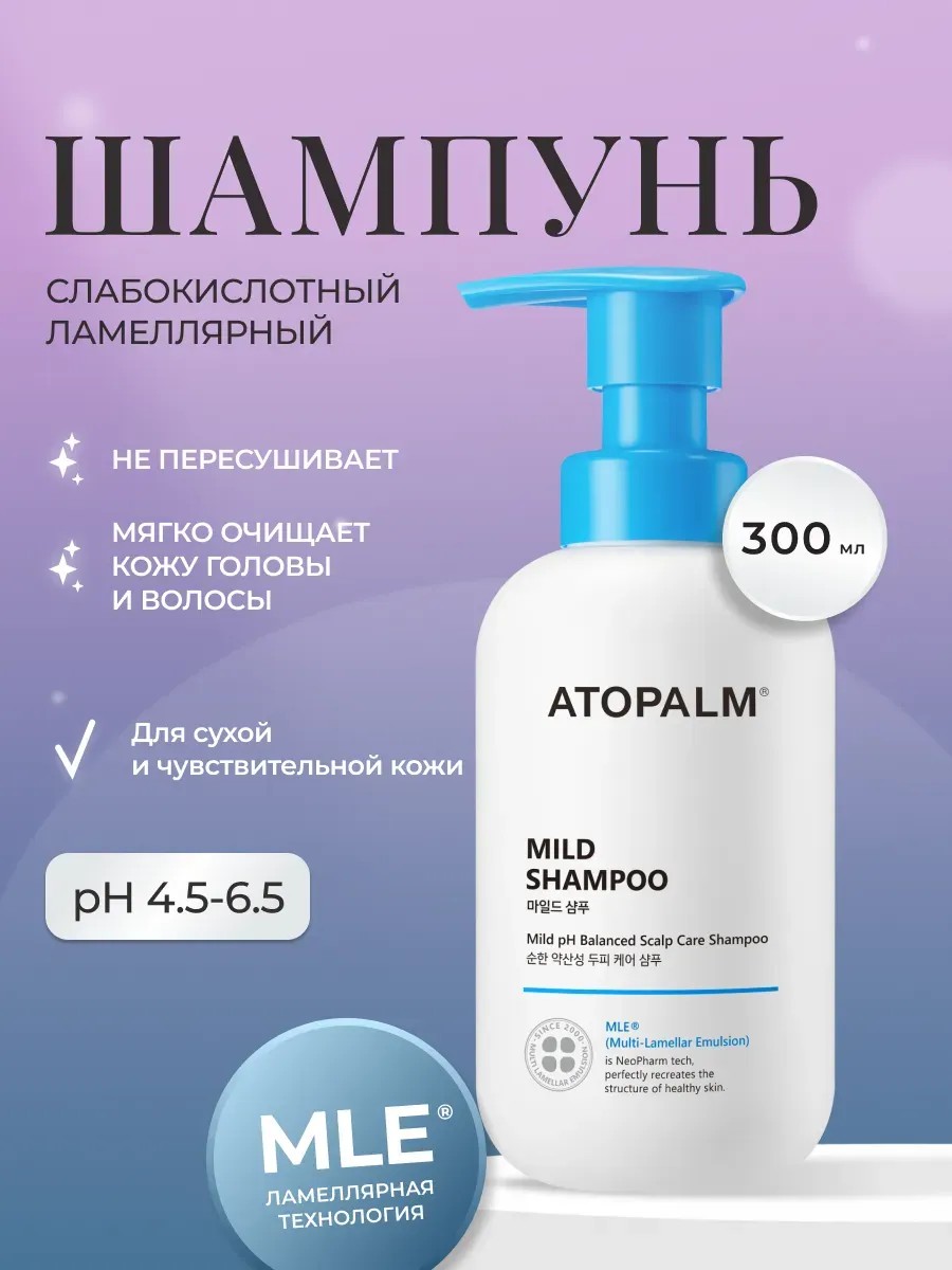 Слабокислотный шампунь Atopalm Mild Shampoo разработан для бережного ухода за сухой и чувствительной кожей головы. Он мягко очищает волосы от загрязнений, удаляет излишки кожного сала и пыль, не вызывая сухости и шелушения. Уровень pH шампуня — 4.5–6.5, что делает его подходящим даже для детей и младенцев. Шампунь содержит натуральные ПАВы, которые смягчают агрессивное воздействие проточной воды и поддерживают естественную микробиоту кожи головы. Он хорошо очищает волосы, предотвращая их сухость и ломкость, а также успокаивает раздражение и снимает зуд. Особенность средства — ламеллярная эмульсия Multi Lamellar Emulsion (MLE). Этот компонент схож с липидами кожи, что позволяет ему встраиваться в защитный слой и восстанавливать его. Такая технология помогает сохранить влагу и предотвратить сухость кожи головы.