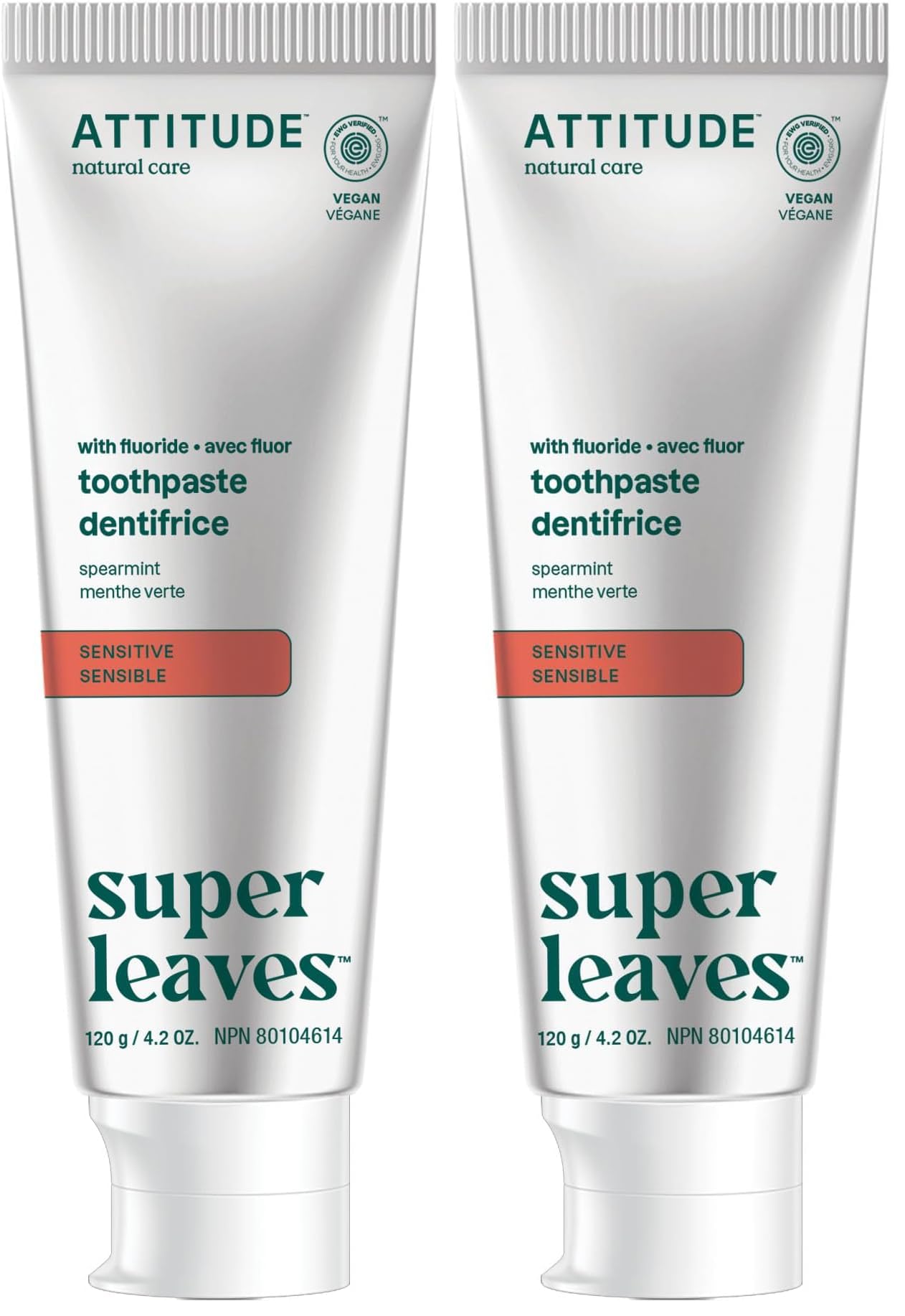 ATTITUDE Toothpaste with Fluoride, Prevents Tooth Decay and Cavities, Vegan, Cruelty-Free and Sugar-Free, Sensitive, Spearmint, 4.2 Oz (Pack of 2) Sensitive 4.2 Ounce (Pack of 2)
