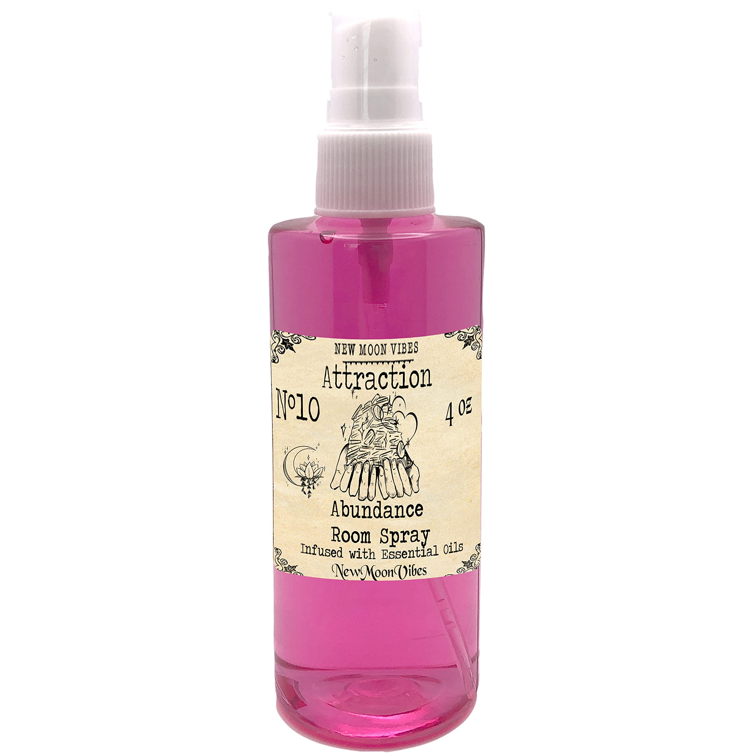 An easy way to manifest and remind yourself to set your intentions in your space and life. The sacred union of our blended potent essential oils and botanicals energetic materials that match to calling in manifestations and creating reality shifts is believed to create an energy path to draw in and open your energy to receive your desired outcome. Also traditionally used as a way to attract what you choose, it is entirely up to you. Compel your target, be it positive energy, inner peace, a peaceful life, a person, job, anything, to come to you. With an intention specific combination of real herbs, essential oils and specific color that correlates to the correct vibes necessary for maximum potency, it is believed to make you magnet, attracting all the right things into your life, including, opportunities in your career, love and romance and draw you closer to your dreams, desires, aspirations, and ambitions. Attraction is a New Moon Vibes handcrafted creation that is commonly used for the attraction of all things desired such as money and love, and also career. Use at home, work or any sacred space as a ritual, such as misting yourself and or the area immediately around you, enveloping yourself in a soft aroma of herb infused essential oils. Be sure to concentrate on your desired manifestation, affirmations and intentions. Essential oils infused with potent herbs are believed to enhance spiritual vibrations of an area they are used in. New Moon Vibes Essential Oil Infused Misting Room Sprays are commonly used to enhance everyday desires, dreams, needs, and focus your personal intentions.