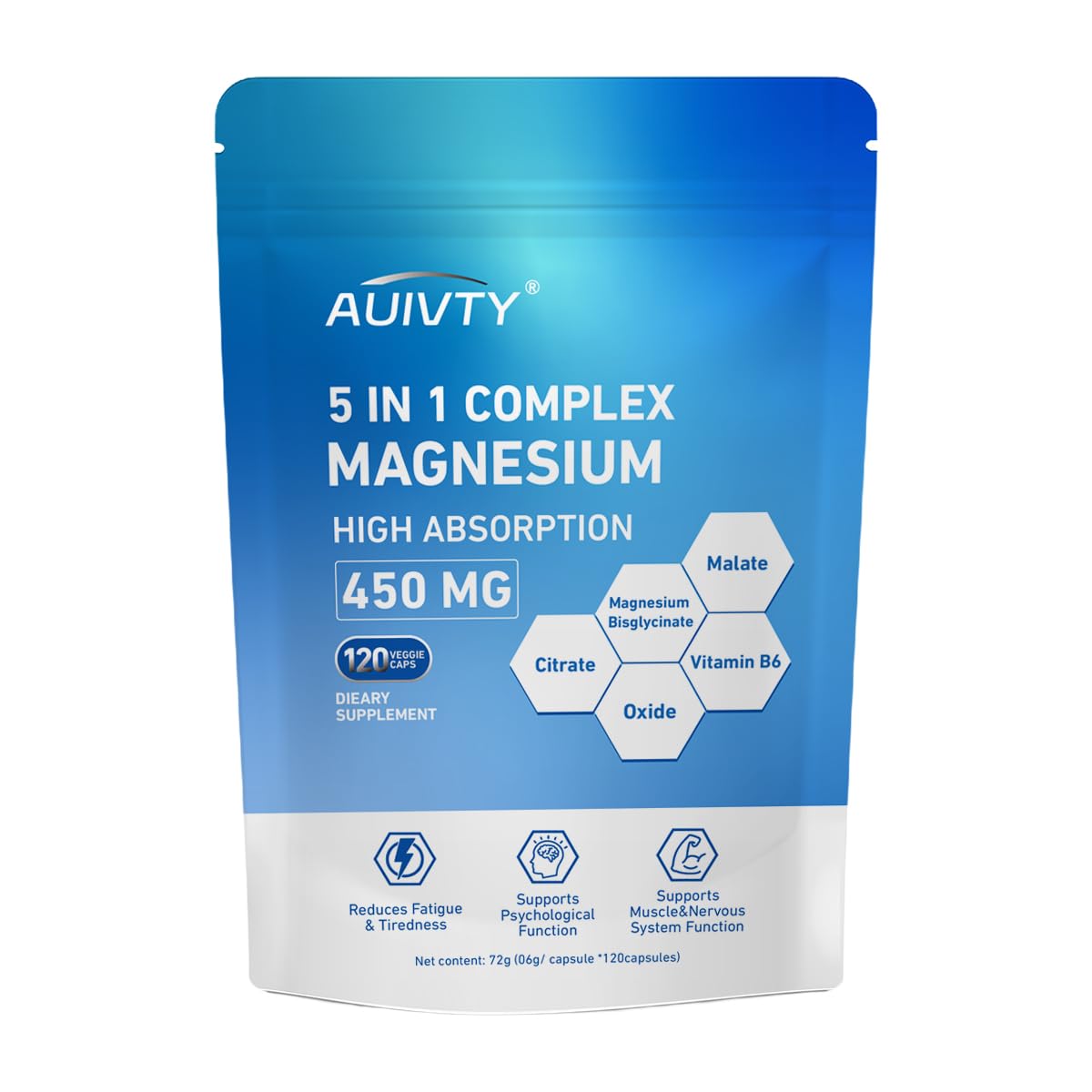 Auivty 5-in-1 Magnesium Complex was created for people who want a simple, well-rounded way to increase their daily magnesium intake. Many modern diets do not provide enough magnesium, an essential mineral involved in hundreds of biochemical reactions throughout the body. Our formula supplies 450 mg of elemental magnesium per serving from three high-absorption forms: magnesium glycinate, malate and citrate, along with vitamin B6 for additional metabolic support. Magnesium is widely recognized for its role in helping muscles and nerves relax, supporting a calm, balanced mood and contributing to comfortable muscle function. When taken consistently as part of a healthy lifestyle, Auivty's complex can be a valuable part of an evening wind-down routine or a daily wellness regimen. Beyond relaxation, magnesium and vitamin B6 support cellular energy production, helping to reduce occasional tiredness and fatigue related to everyday physical or mental demands. Magnesium also contributes to the maintenance of normal bones and supports a healthy heartbeat, making it a key nutrient for overall wellness. Auivty 5-in-1 Magnesium Complex is made with carefully selected ingredients and a clean label philosophy. Our vegetarian capsules are non-GMO, vegan and free from sugar, gluten, soy, dairy, nuts and artificial additives. Each batch is produced in a cGMP-compliant, FDA-registered facility and is lab tested for quality and purity, so you can feel confident adding this magnesium formula to your daily routine. These statements have not been evaluated by the Food and Drug Administration. This product is not intended to diagnose, treat, cure, or prevent any disease. Always consult your healthcare professional before using any dietary supplement, especially if you are pregnant, nursing, have a medical condition, or are taking medications.VEGAN, NON-GMO CLEAN LABEL – Auivty Magnesium Complex comes in easy-to-swallow vegetarian capsules and is non-GMO, vegan and free from sugar, gluten, soy, dairy, nuts and artificial ingredients. Manufactured in a cGMP-compliant, FDA-registered facility and lab tested for quality and purity. MUSCLE, NERVE, BONE HEART HEALTH – As an essential mineral, magnesium supports normal muscle and nerve function, contributes to maintaining normal bones and helps support a healthy heartbeat. Auivty's balanced complex offers broad, everyday support for whole-body wellness. ENERGY METABOLISM FATIGUE SUPPORT – Magnesium and vitamin B6 work together in many enzymatic reactions that support cellular energy production. By helping energy metabolism run smoothly, this complex can help reduce occasional tiredness and fatigue associated with low dietary intake. RELAXATION CALM SUPPORT – Magnesium plays a key role in helping muscles relax and supporting a calm, balanced mood. Taken regularly with a healthy lifestyle, this formula is crafted to support relaxation after long days and to complement your evening wind-down routine. 5-IN-1 HIGH ABSORPTION FORMULA – Auivty 5-in-1 Magnesium Complex provides 450 mg of elemental magnesium per serving from magnesium glycinate, malate and citrate, plus vitamin B6. This combination is designed to help fill daily magnesium needs with forms known for their excellent absorption.