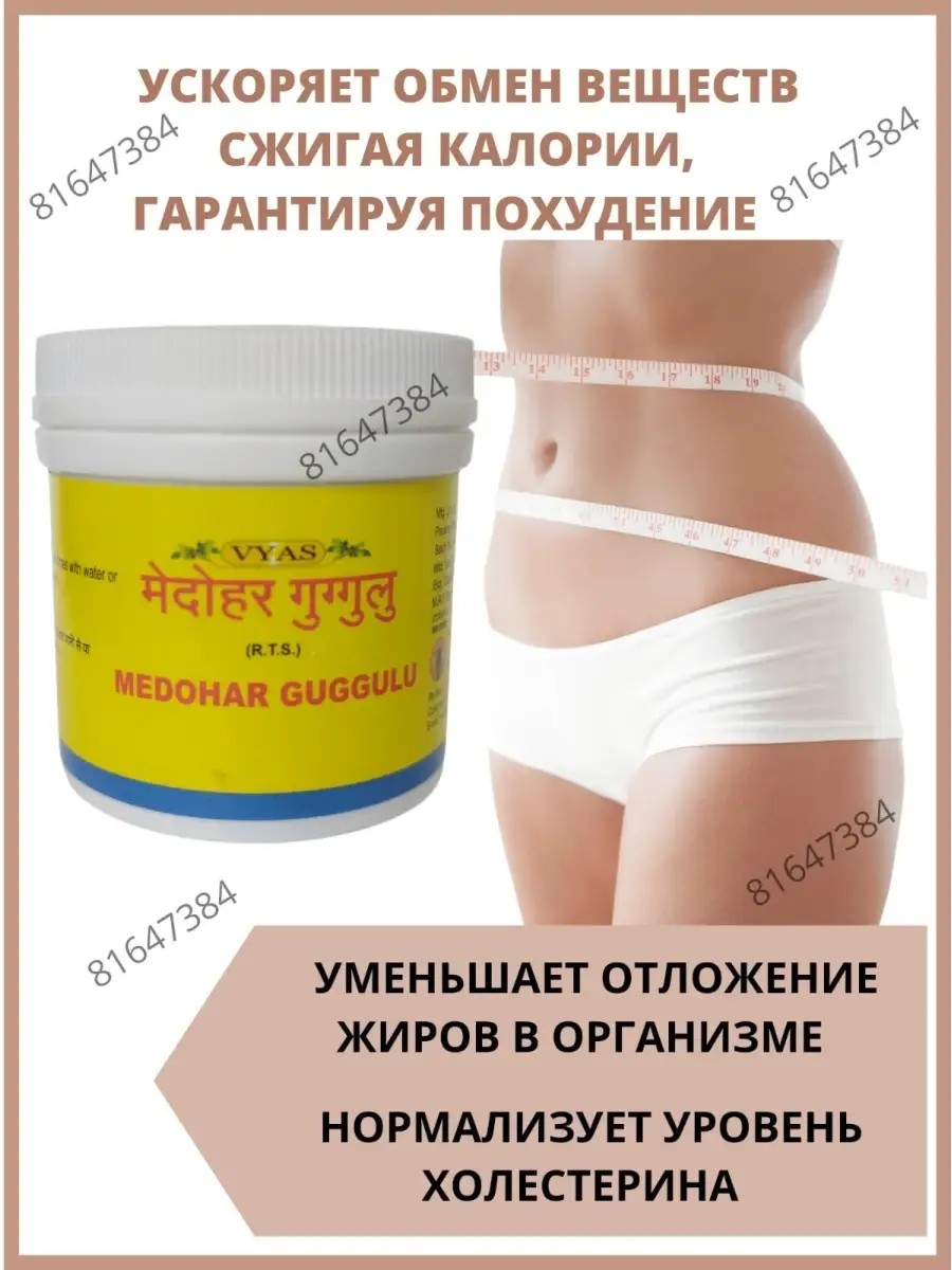 Medohar guggulu Контроль веса 100тб Медохар Vyas **Медохар Гугул** - препарат, который исключительно благотворно влияет на пищеварительную и желчную системы, снижает способность организма накапливать жир и уровень липидов в крови, а также предотвращает образование атеросклеротических бляшек в артериях. Он обладает способностью активировать метаболизм и стимулировать сжигание калорий, способствуя безопасному похудению.Медохар Гуггул регулирует образование и расщепление жировой ткани, помогая привести фигуру в норму.Также средство помогает пищеварительной и желчевыводящей системе и очищает организм в целом. Защищает от таких опасных нарушений, как атеросклеротические бляшки, увеличенный просвет сосудов, тромбоз.Медохар Гуггула при малоподвижном и сидячем образе жизни, высококалорийной диете с большим количеством жиров и наличии избыточного веса.**Не является лекарственным средством.**Перед применением проконсультируйтесь с врачом аюрведы