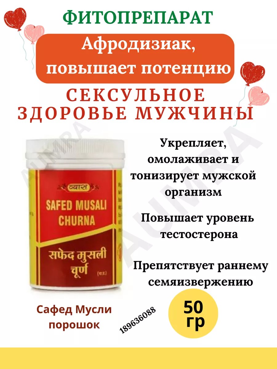 Safed Musali от компании Vyas, порошок - натуральный аюрведический афродизиак для мужчин, стимулирует потенцию и восстанавливает мужское здоровье и повышает мужскую силу либидо иммунитет. Для современного мужчины очень важно ощущать свои сексуальные возможности, это повышает качество жизни. Препарат улучшает настроение и дарит мужчине уверенность в себе. Показания к применению: половая слабость потеря сексуальной активности у мужчины отсутствие сексуального влечения преждевременная эякуляция низкое качество семени мужское бесплодие потеря энергии вялость сексуальная апатия возрастные изменения упадок сил повышенная физическая и психологическая утомляемость. Действие: усиливает сексуальное желание восстанавливает интерес к сексуальному контакту повышает выносливость мужчины увеличивает продолжительность сексуального контакта восстанавливает мужскую силу помогает справиться с преждевременной эякуляцией. Применение: принимать по 1/2 ч.л два раза в день или по назначению специалиста. Внимание! Предоставленная информация не должна быть расценена в качестве замены профессионального медицинского назначения. Пожалуйста, воздержитесь от использования данной информации для самостоятельной диагностики или лечения без дополнительной консультации с лечащим врачом. Не является лекарственным средством, необходима консультация специалиста