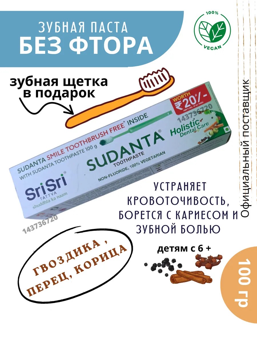 Зубная паста Sudanta SriSriТравяной состав пасты защищает ваши зубы, укрепляет десны и позволяет надолго сохранить ощущение чистых зубов и свежего дыхания.Активные ингредиенты: Гвоздика душистая - имеет антисептическое, антибактериальное, противогрибковое, обезболивающее свойство. Корица - обладает антисептическим, антимикробным, вяжущим свойством, укрепляет иммунитет, содержит дубильные вещества. Испанская вишня укрепляет ткани зубов и десен. Дуб малазийский имеет кровоостанавливающее действие, ускоряет процесс заживления ран. Перец черный - обладает антибактериальными свойствами и может применятся для лечения гнойных нарывов, улучшает кровообращение в дёснах. Лаванда снижает зубную боль, затягивает раны.