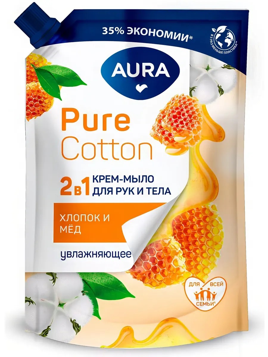 Aura Pure Cotton 2-in-1 Moisturizing Cream Soap with Cotton and Honey, Doypack, 450 ml. Aura Pure Cotton 2-in-1 Moisturizing Cream Soap with Cotton and Honey, Doypack, 450 ml. The delicate texture of AURA Pure Cotton cream soap gently cleanses the skin of your hands and body without causing dryness or irritation. Natural ingredients and extracts soften and tone the skin, leaving it feeling fresh and comfortable. Honey extract gives the skin firmness and elasticity, helping to eliminate dryness and flaking. Directions: Apply a small amount of soap to damp hands, lather, and rinse thoroughly with water. Ingredients: Aqua, Sodium Laureth Sulfate, Sodium Chloride, Cocamide DEA, Propylene glycol, Gossypium Herbaceum Seed Extract, Honey Extract, Styrene/ Acrylates Copolymer, Coco-Glucoside, Citric Acid, Parfum, Benzyl salicylate, Methylisothiazolinone, Methylchloroisothiazolinone, Cl 19140, Cl 14720.