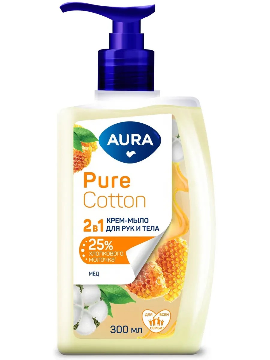 Aura Крем-мыло Pure Cotton 2в1, увлажняющее, хлопок и мёд, 300 мл