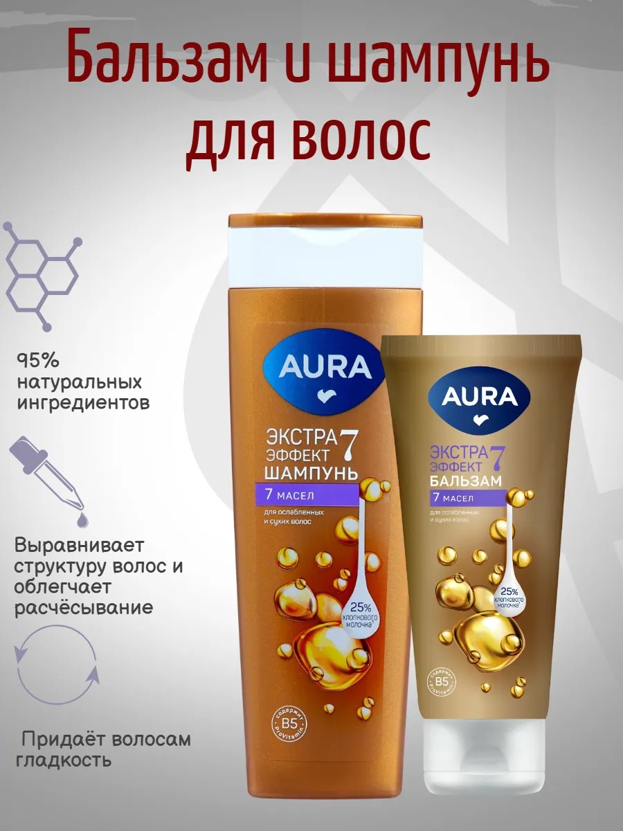 | Комплектация | Aura Шампунь для волос 7 масел 380мл, Бальзам для волос 250 мл |