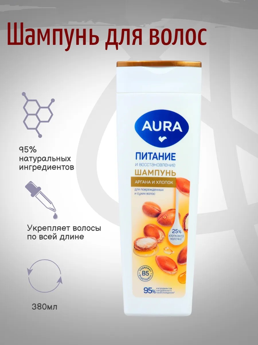 Шампунь AURA Питание и восстановление предназначен для поврежденных и ослабленных волос, нуждающихся в интенсивном уходе. Бережно очищает кожу головы, питает и восстанавливает волосы по всей длине. Масло арганы увлажняет, смягчает и питает каждый волосок, предупреждает появление секущихся кончиков. Провитамин В5 восстанавливает поврежденную структуру волос, глубоко питает и разглаживает их. Хлопковое молочко легко проникает в структуру волос, нежно ухаживает за ними и придает особую мягкость и блеск. Шампунь на 95% состоит из ингредиентов натурального происхождения. Благодаря активной формуле тройного ухода волосы восстанавливаются и приобретают здоровый внешний вид при его регулярном использовании. Для наилучшего эффекта рекомендуем использовать вместе с бальзамом AURA Питание и восстановление.
