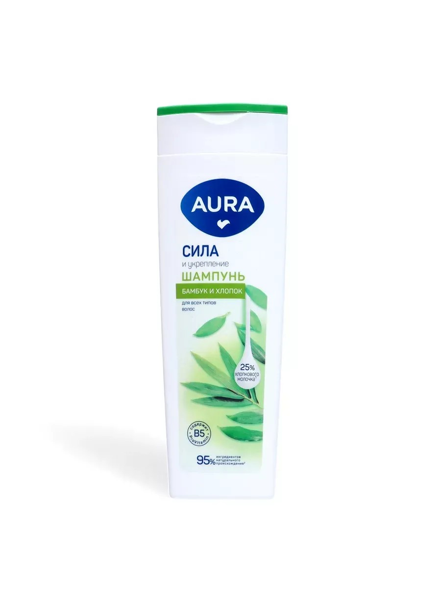 Шампунь Aura Сила и укрепление идеально подходит для всех типов волос. Бережно очищает кожу головы и укрепляет волосы по всей длине, придавая им особую силу и прочность.Экстракт бамбука придает волосам больше упругости, увлажняет, тонизирует и укрепляет структуру волос, стимулируя их рост. Провитамин В5 восстанавливает поврежденную структуру волос, глубоко питает и разглаживает их.Хлопковое молочко легко проникает в структуру волос, нежно ухаживает за ними и придает особую мягкость и блеск. Шампунь на 95% состоит из ингредиентов натурального происхождения.Благодаря активной формуле тройного ухода волосы становятся сильными и крепкими при его регулярном использовании. Для наилучшего эффекта рекомендуем использовать вместе с бальзамом Aura Сила и укрепление.Способ применения: нанесите небольшое количество шампуня на влажные волосы, слегка помассируйте и смойте водой. Подходит для ежедневного использования.Состав: Aqua, Sodium Laureth Sulfate, Cocamidopropyl Betaine, Sodium Chloride, Glycerin, Cocamide DEA, Polyquaternium-10, Propylene Glycol, Gossypium Herbaceum (Cotton) Extract, Bambusa Arundinacea (Bamboo) Leaf Extract, Persea Gratissima (Avocado) Fruit Extract, Panthenol, Parfum, Methylchloroisothiazolinone, Methylisothiazolinone, Citric Acid, Hexyl Cinnamal, CI 19140, СI 42090, CI 15985
