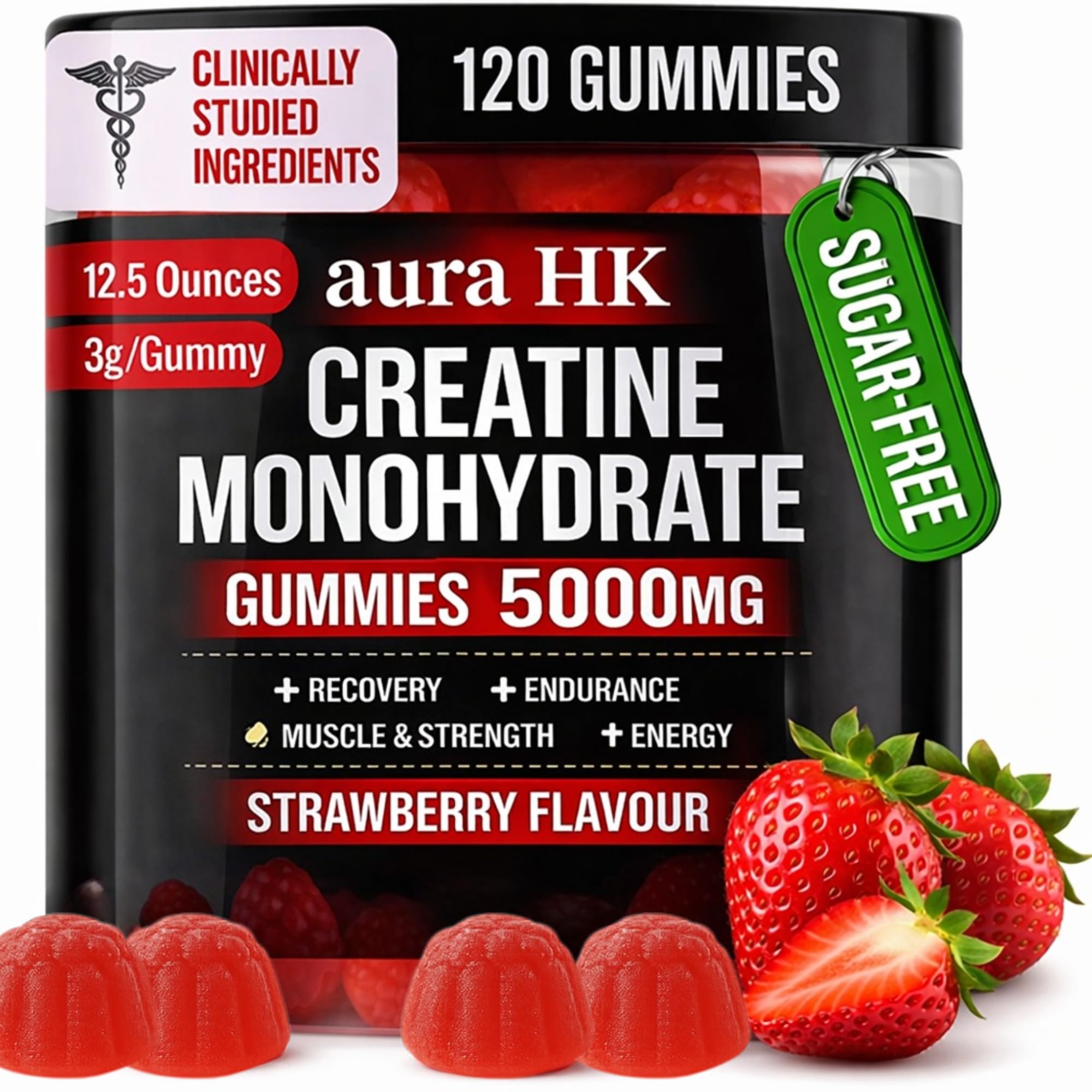 aura HK Creatine Monohydrate Gummies for Men & Women 5000 mg Strawberry Box 3rd Party Tested Creatine Chews for Muscle Growth Strength & Energy Support Sugar Free Vegan 120 Count