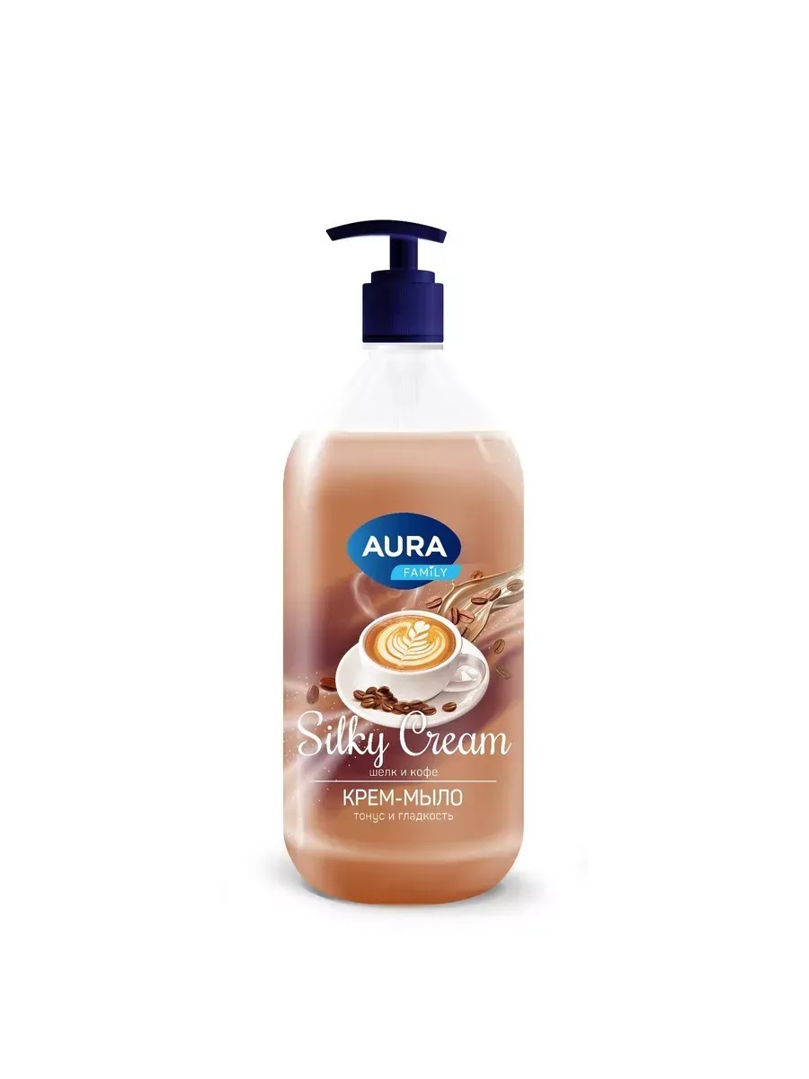 Крем-мыло AURA Silky Cream с экстрактами шелка и кофе бережно очищает, не вызывая сухости и раздражения, окутывает кожу нотками манящего кофейного аромата! Экстракт кофе обладает антиоксидантным эффектом, прекрасно тонизирует кожу и стимулирует выработку коллагена.Экстракт шелка дарит коже ощущение гладкости, превосходно увлажняет и смягчает ее.Результат – кожа рук мягкая и сияющая как шелк!Крем-мыло AURA Silky Cream обязательно понравится взрослым и детям. А большой формат упаковки поможет сэкономить бюджет семьи.