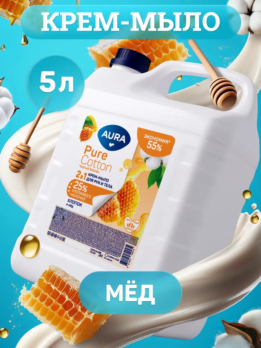Aura Жидкое мыло для рук и тела 5л мёд и хлопковое молочко