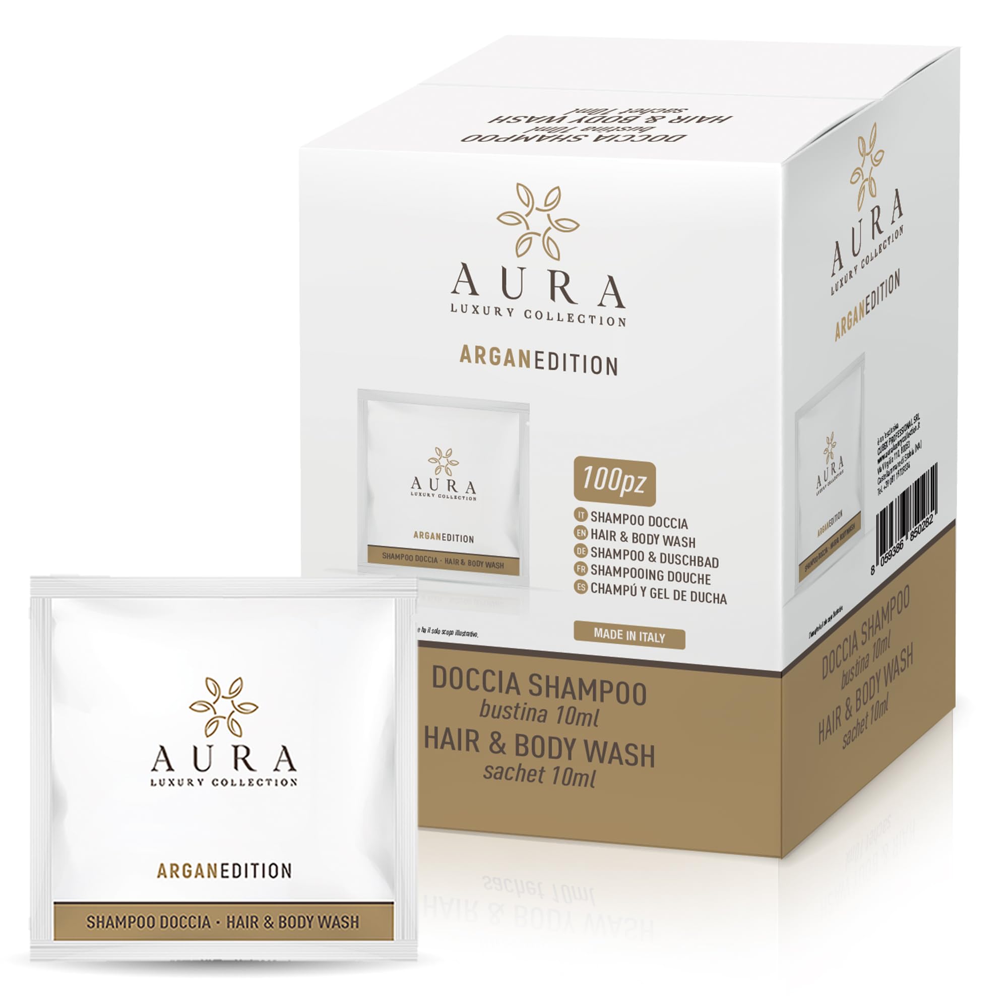 DIRECTIONS FOR USE Wet hair, apply shampoo, massage to lather, rinse, repeat if necessary. SAFETY WARNING Avoid contact with eyes.Purchase it for: hotels, bed and breakfasts, guesthouses, resorts, swimming pools, gyms, beauty salons, spas, wellness centers, beaches, and any other accommodation offering complimentary services. Ideal for B Bs and hotels: these shampoo and shower sachets are an elegant addition to your services, leaving your guests feeling fresh and invigorated during their stay. Pamper your guests: with our complimentary line, you'll leave a lasting impression on your clients. Thanks to the care and attention to detail and the quality of the raw materials, you'll make every stay a unique experience to remember and share. White Argan: white argan oil is known for its nourishing and regenerating properties for skin and hair. This product is designed to hydrate, protect, and revitalize your skin, leaving it soft, radiant, and visibly rejuvenated. You will receive: 300 shampoo and shower sachets formulated with white argan extract, lightly scented, and leaving a pleasant fragrance on the skin.Aura Luxury Collection Lot de 300 sachets de douche shampooing doux 10 ml avec extraits d'argan blanc 1 unità (Confezione da 300)DESCRIPTION DU PRODUIT MODE D'EMPLOI Mouiller les cheveux, appliquer le shampooing, masser pour former de la mousse, rincer, répéter si nécessaire AVERTISSEMENT DE SÉCURITÉ Évitez tout contact avec les yeux.Achetez-le pour : hôtels, chambres d'hôtes, maisons d'hôtes, resorts, piscine, salle de sport, centre de beauté, spa, centre de bien-être, plage et tout autre établissement d'hébergement offrant des services de courtoisie. Idéal pour B B et Hôtel : ces sachets de douche shampoing représentent un ajout élégant aux services offerts, laissant vos invités frais et revigorés pendant leur séjour. Prenez soin de vos invités : avec notre ligne de courtoisie, vous laisserez une marque indélébile chez vos clients, grâce au soin et à la recherche des détails et à la qualité des matières premières, vous rendrez chaque séjour une expérience unique à mémoriser et à raconter. Argan blanc : l'argan blanc est connu pour ses propriétés nourrissantes et régénérantes pour la peau et les cheveux. Ce produit est conçu pour hydrater, protéger et revitaliser votre peau, la laissant douce, lumineuse et visiblement rajeunie. Vous recevrez : 300 sachets de douche shampoing formulés à l'extrait d'argan blanc, parfumés et laissent une bonne odeur sur la peau.