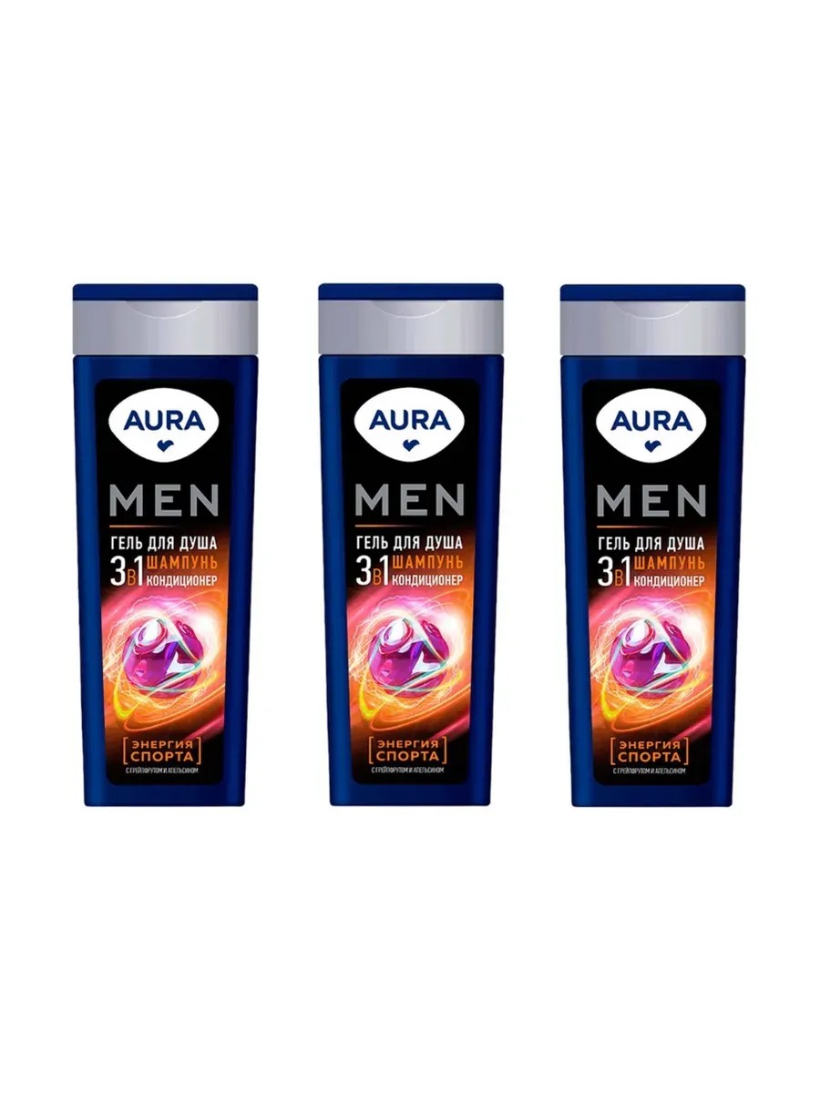 Aura Men Гель для душа 3в1 Энергия спорта грейпфрут и апельсин, 380 мл, 3 шт. Натуральный гель для душа Aura Men Энергия cпорта представляет собой деликатное средство для очищения кожи, разработанное из натуральных компонентов. Его нежная текстура и приятный аромат создают ощущение свежести и комфорта на протяжении всего дня.
