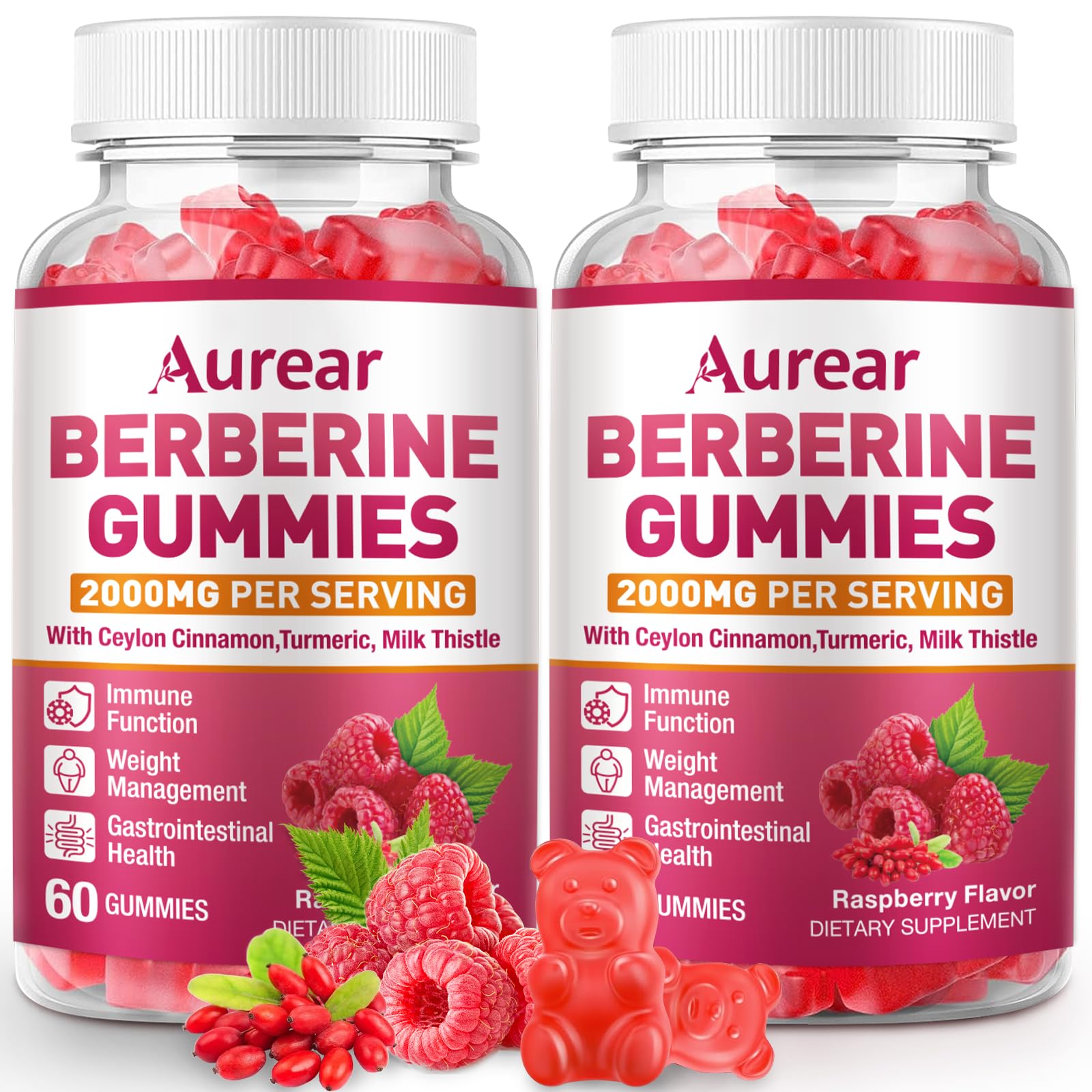 Aurear Berberine Gummies 2000mg High Potency Berberine HCI Suitable for Men Women and Children of All Ages it Supports Immune and Gut Health.Raspberry FlavorSupport - 120 Count
