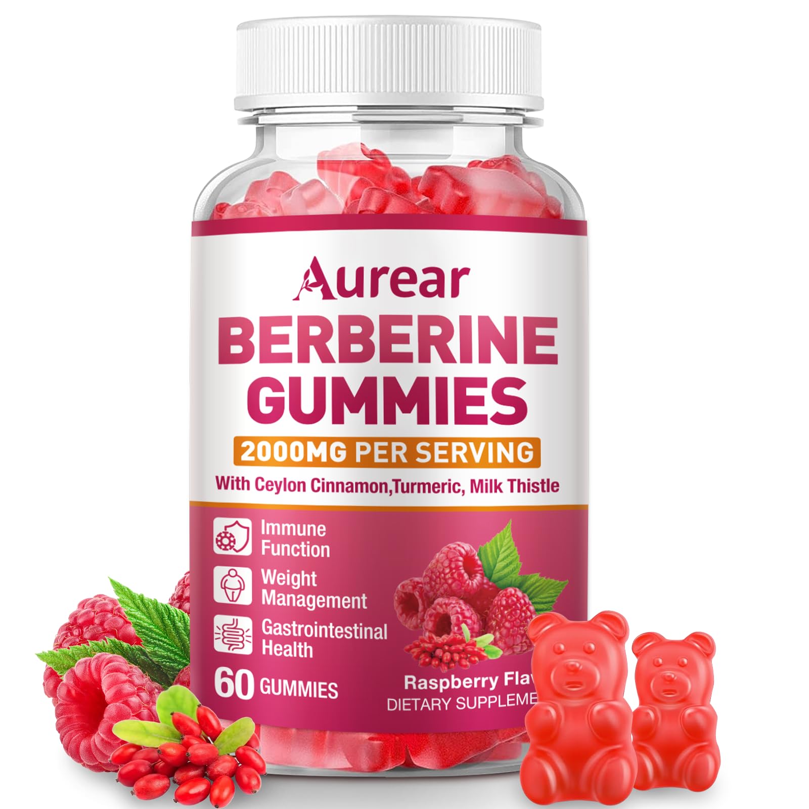 Aurear Berberine Gummies 2000mg High Potency Berberine HCI Suitable for Men Women and Children of All Ages it Supports Immune and Gut Health.Raspberry FlavorSupport - 60 Count