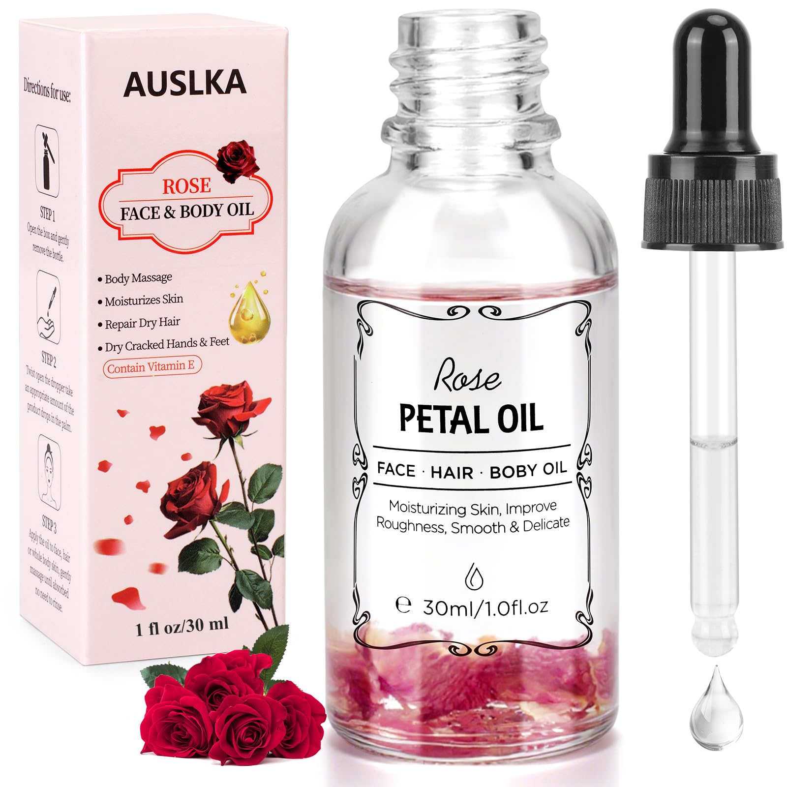 Rose Essential Oil – Nourish Glow Facial Rose Oil Indulge in the luxurious hydration of pure rose essential oil, enriched with natural antioxidants. This exquisite oil deeply moisturizes, leaving skin soft, supple, and radiant. Its fast-absorbing formula revitalizes dry or dull skin, promoting a youthful glow. The delicate floral scent soothes senses while vitamins E repair and protect. Perfect for face, body, or hair—unlock nature's secret for silky, nourished skin. A must-have for your self-care ritual!SKIN-FRIENDLY: All-natural essential oils, made with natural olive and sunflower oils, plus rose essential oils to revitalize your skin. EASY TO USE: Dropper head design, you can make the face of every drop of essential oil is not wasted, skincare drops into the palm of the wipe on the skin, moisturizing and fragrant, but also can lighten stretch marks and scars. WIDE RANGE OF USES: Dried rose flower oils can be used not only on the face and body, but also on dry hair, as well as on dry and chapped hands and feet, and on scars on the body. NATURAL INGREDIENTS: Contains vitamin E, scavenging free radicals anti wrinkles, A tocopherol can resist oxidizing substances, can eliminate facial wrinkles, preventing skin aging. NOURISH YOUR SKIN WITH OILS: Pure natural ingredients of rose face oil, refreshing and non-greasy, the use of water and oil wrapping technology, wipe open quickly absorbed by the skin, locking the skin moisture is not lost, moisturize dry skin, soften keratin, so that your skin regained its luster.