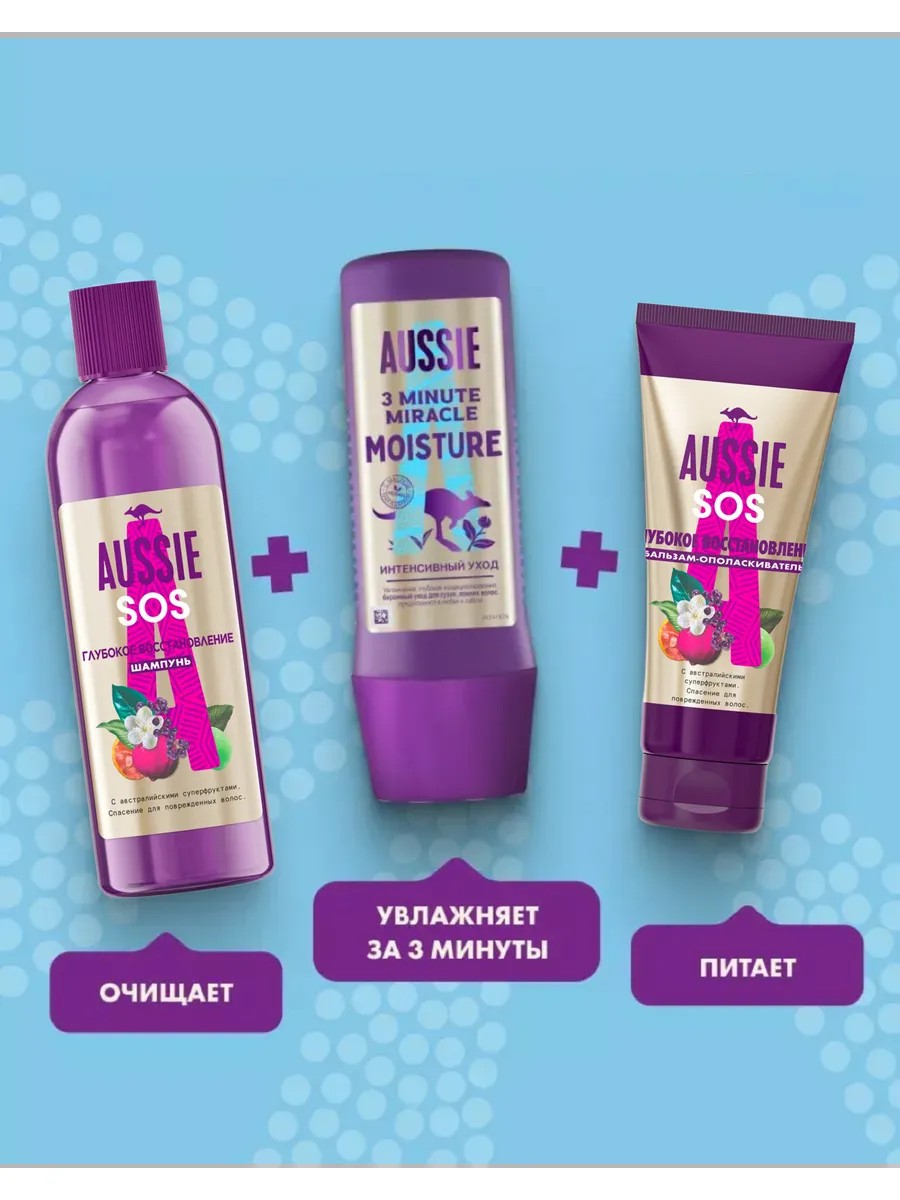 Набор для волос Aussie подарит вашим локонам сияние и силу. В состав набора входят шампунь 290мл, бальзам-ополаскиватель 200мл и средство для интенсивного ухода 225мл разработанные с использованием уникальной формулы, которая бережно очищает волосы и придает им шелковистость. Регулярное использование набора поможет восстановить поврежденные волосы, сделать их более послушными и блестящими. Набор Aussie — это идеальный выбор для тех, кто хочет получить профессиональный уход за волосами в домашних условиях.