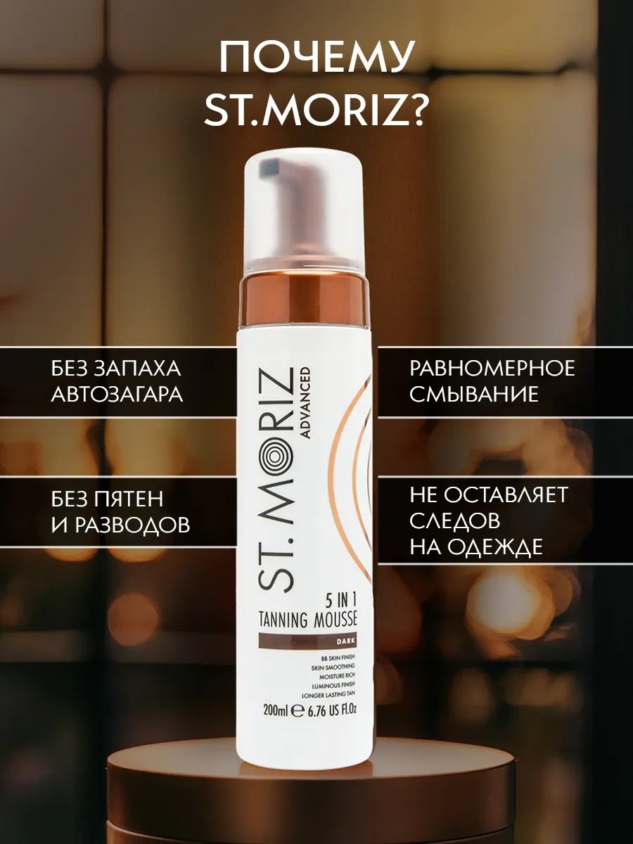 Автобронзант st moriz нового поколения с инновационной формулой 5-в-1 обеспечивает безупречный бронзовый оттенок загара на длительное время, ровный тон кожи и максимум увлажнения. Легкий, воздушный мусс комфортно наносится и быстро высыхает на коже. Благодаря уникальной технологии BB покрытия, средство помогает идеально выравнивать поверхность кожи, маскируя ее недостатки и неровности. Мусс бережно ухаживает за кожей, смягчает ее и увлажняет, благодаря содержанию Алое Вера. Запатентованная ароматическая формула оставляет на коже благоухание изысканного аромата. Содержит коричневую смываемую тонировку, которая тонирует кожу во время нанесения, благодаря чему можно контролировать равномерность нанесения автобронзанта. Проявление оттенка загара происходит в течение 4-6 часов после нанесения. Загар держится до 10 дней, в зависимости от типа кожи. Содержит DHA (дигидроксиацетон). Подходит для тела и лица. Для всех типов кожи. Оттенок Dark (темный) - подходит для смуглой или загорелой кожи. Применение: Наносите средство только на сухую чистую кожу. Перед использованием встряхните закрытый флакон. Выдавите небольшое количество мусса на рукавичку, затем плавными восходящими движениями распределите мусс на коже тела и лица с помощью рукавички-аппликатора. Начинайте нанесение средства с лодыжек и завершайте на коже лица, шеи и внешней стороне ладоней. При нанесении на пальцы рук, слегка согните пальцы, чтобы в складках кожи на костяшках не осталось белых полос. Не забывайте про область ушей, заднюю сторону шеи и коленей. Использование рукавички St.Moriz поможет избежать окрашивания ладоней и гарантирует равномерное нанесение средства на кожу. Не соприкасайтесь с поверхностью ткани до тех пор, пока кожа не высохнет полностью. Загар проявится на коже в течение 4-6 часов, в этот период избегайте контакта кожи с водой. Рекомендуется смыть средство через 4-6 часов теплой водой без использования мыла или геля для душа.