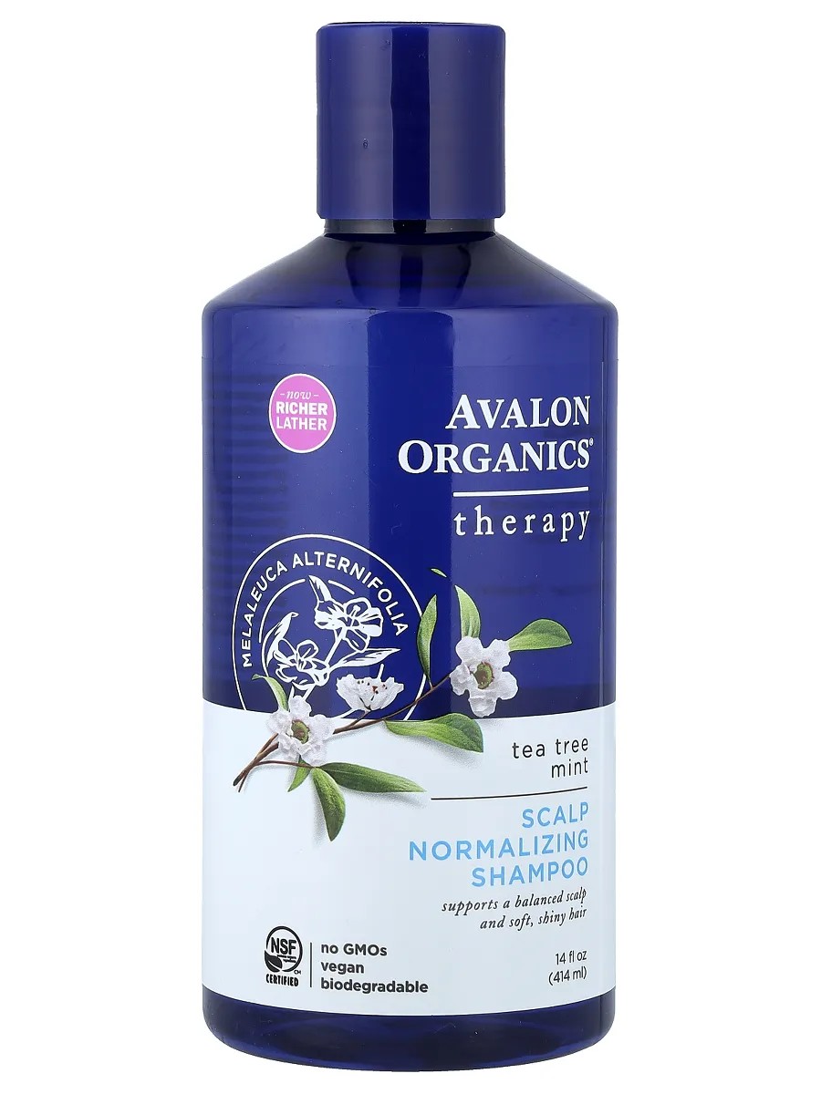 Avalon Organics Therapy Scalp Normalizing Shampoo Tea Tree Mint 414 ml – это очищающий шампунь для нормализации состояния кожи головы, обогащенный органическим маслом чайного дерева и экстрактом мяты. Формула разработана для глубокого очищения, устранения зуда и восстановления баланса кожи головы. Подходит для регулярного использования при жирных корнях и склонности к перхоти.