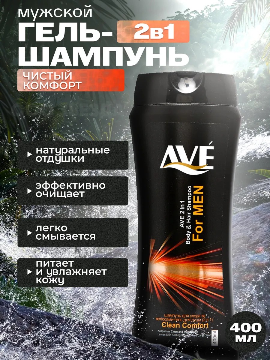 Шампунь-гель для тела AVE for Men Clean comfort средство выполняющее сразу две функции. Гель душ для тела и шампунь для волос. Делает волосы не просто чистыми, но и податливыми. Отлично их подготавливает к дальнейшему расчесыванию. Кожа на теле становится гладкой, чистой и получает целый заряд свежести. Разработан для мужчин.