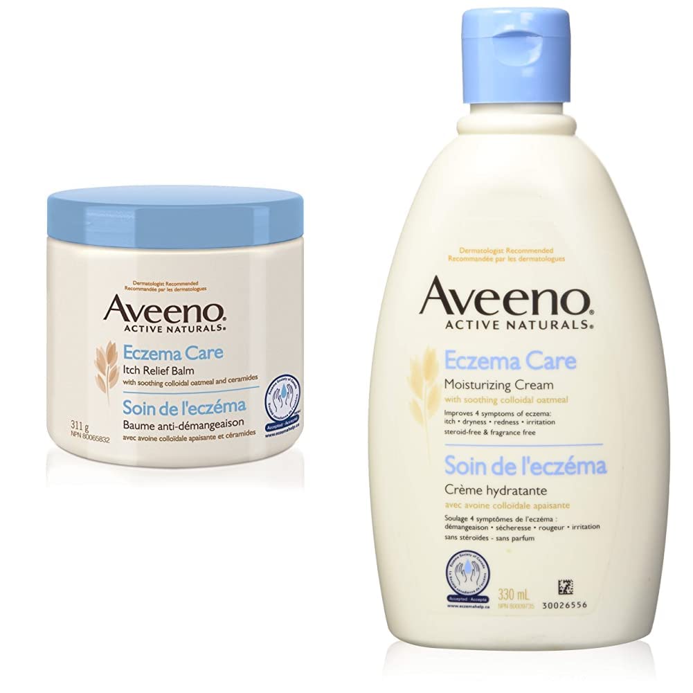 Aveeno Lotions Eczema Care Anti-Itch Balm, Eczema Treatment Cream With Colloidal Oatmeal, 311g Only AVEENO has harnessed the soothing power of ACTIVE NATURALS colloidal oatmeal to create a protective balm that intensely moisturizes and helps relieve dry, itchy, irritated skin due to eczema without leaving a greasy feeling behind. This eczema cream has a unique formula that helps strengthen the skin's natural moisture barrier and helps prevent recurrence of dry, itchy skin from eczema. This eczema treatment is gentle enough for everyday use on sensitive skin. Aveeno Eczema Care Moisturizing Cream - Itchy Skin, Dry Skin, Sensitive Skin, Skin Treatment - Fragrance Free, 330 mL Aveeno eczema care moisturizing cream temporarily protects and helps relieve minor skin irritation and itching due to eczema. After using the cream, 90 percent of eczema patients experience more comfortable skin. Its active naturals triple oat formula plays a key role in soothing dry and itchy skin and is clinically shown to help relieve the four symptoms of eczema: redness, itching, dryness, and irritation. Recommended by dermatologists and recognized by the eczema society of canada, this steroid- and fragrance-free cream is gentle enough for the entire family, even babies' delicate skin. Aveeno eczema care moisturizing cream comes in a 166-millilitre tube or a 330-millilitre bottle. Brazil study of 71 subjects, 12 weeks.The bundle includes one 311g tube of Aveeno Eczema Care Anti-Itch Balm and one 330mL bottle of Aveeno Eczema Care Moisturizing Cream (fragrance-free). The balm is non-greasy, while the cream's unique formula helps strengthen skin's natural barrier function and prevents recurrence of dry skin. Developed with leading dermatologists, these eczema treatments are gentle enough for the entire family, including babies' delicate skin. Anti-itch balm (311g) intensely moisturizes and helps relieve itch, while the moisturizing cream (330mL) improves 4 symptoms of eczema - itch, dryness, redness, and irritation. Provides clinically proven relief from eczema flare-ups and intense itching with Aveeno's patented Triple Oat formula and colloidal oatmeal.