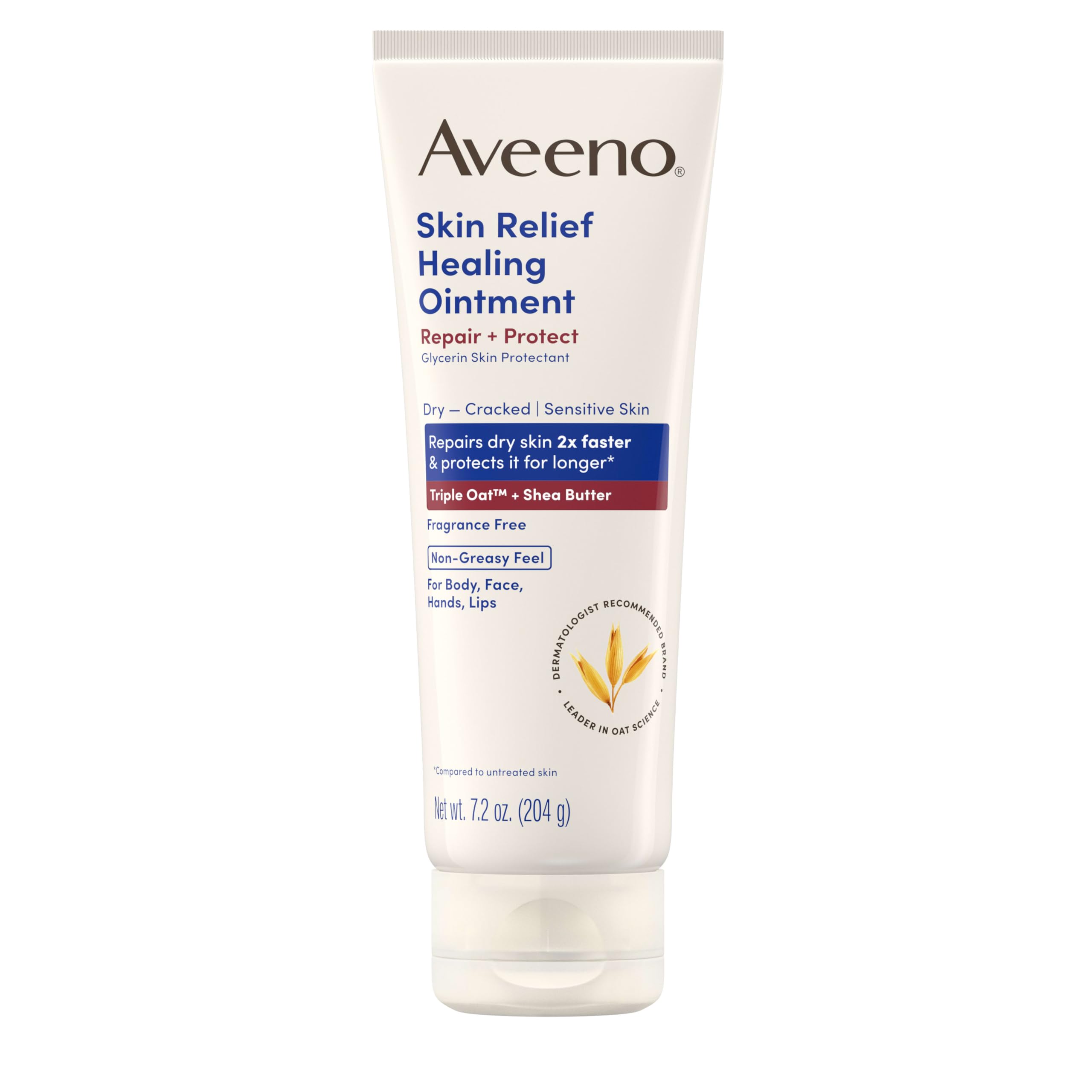 Aveeno Skin Relief Healing Ointment is a 7.2 oz fragrance-free healing ointment and glycerin skin protectant for chapped skin relief and cracked skin repair on extra dry, sensitive skin. Clinically proven to lock in moisture for up to 72 hours to repair dry skin 2X faster protects for longer . This non-greasy formula helps strengthen the skin's natural moisture barrier while shielding against the drying effects of wind and cold weather. Formulated with a soothing Triple Oat Complex—oat flour, oat oil, and oat extract, plus shea butter glycerin, this dry skin ointment is clinically proven to lock in moisture for 72 hours. Suitable for day night use, apply as needed to the body, face, hands, and lips. Ideal for targeted care rather than full-body application, this versatile ointment provides relief for chafed, chapped, or cracked areas and helps keep dryness from returning between uses. Allergy-tested and suitable for sensitive skin, it is free of petroleum, lanolin, dyes, parabens, with no added fragrance. From a dermatologist-recommended skin care brand for over 70 years, this clinically proven healing ointment offers durable moisture, barrier support, and everyday comfort you can count on in any season.A dermatologist-recommended brand for over 70 years: This versatile healing ointment hydrates, soothes and protects non-greasy, fragrance-free, and free of petroleum, lanolin, dyes parabens. Suitable for face, body, hands lips apply morning and night for hydration that lasts up to 72 hours to help strengthen the skin's natural moisture barrier. A dermatologist-recommended skin care brand for over 70 years. Gentle enough for everyday use: This fragrance-free ointment provides 72 hours of moisture and is allergy-tested and free of petroleum, lanolin, parabens, and dyes. Apply as needed, morning and night, for lasting hydration and protection. Glycerin skin protectant: Helps prevent, protect relieve chafed, chapped or cracked skin lips shields against dryness from wind cold gentle for sensitive skin daily spot treatment on heels, hands, face rough patches. 7.2 oz Aveeno Skin Relief Healing Ointment: With triple oat complex shea butter glycerin to care for extra dry, chapped or cracked skin non-greasy feel fragrance-free, clinically proven to lock in moisture for up to 72 hours.