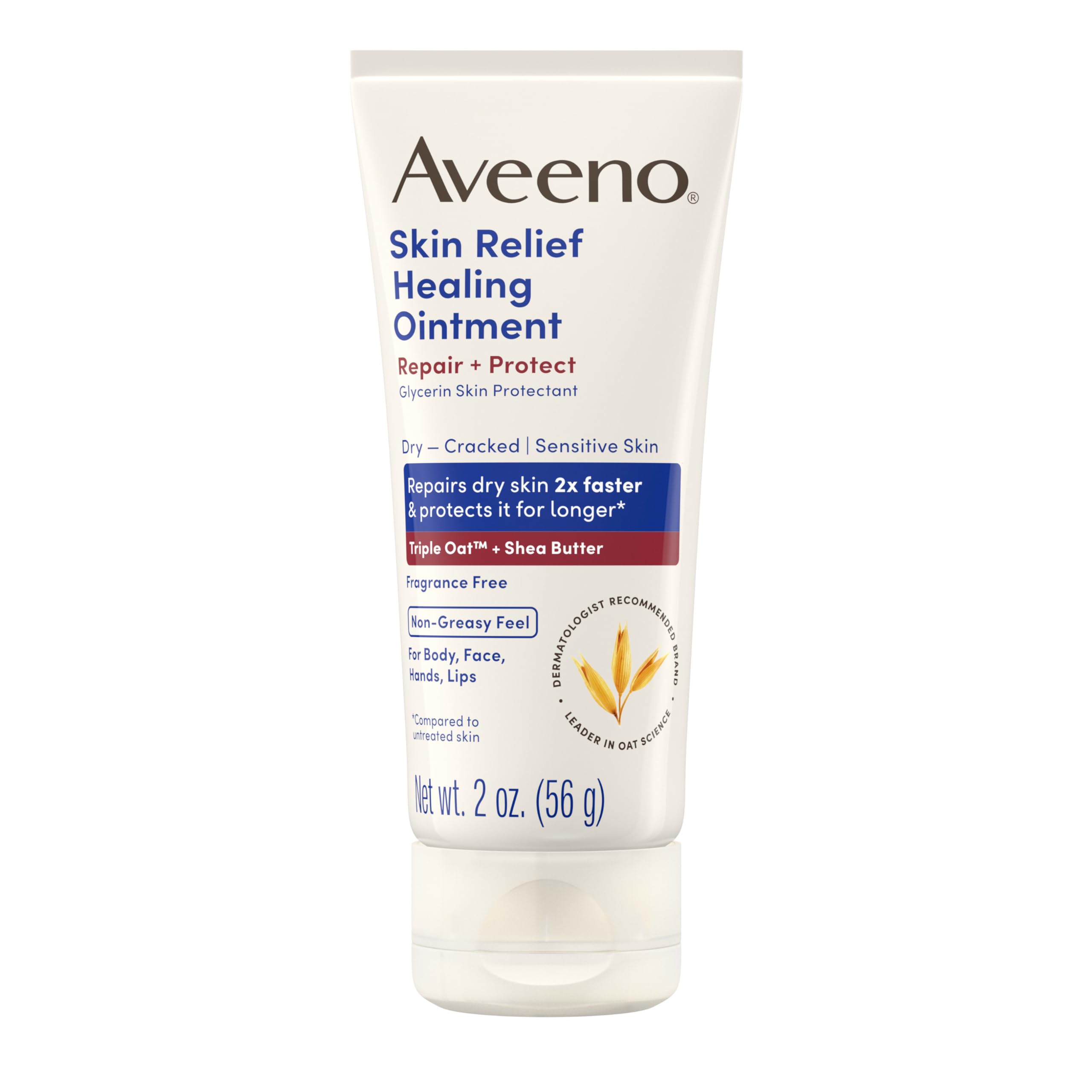 Help relieve chafed, chapped, or cracked skin with Aveeno Skin Relief Healing Ointment. This fragrance-free ointment and glycerin skin protectant repairs dry skin 2X faster and protects it for longer while helping protect from the drying effects of wind and cold weather. Formulated with a soothing Triple Oat complex, oat flour, oat oil, oat extract, plus shea butter and glycerin, this dry skin ointment is clinically proven to lock in moisture for up to 72 hours and to help strengthen the skin's natural moisture barrier. This skin healing ointment is non-greasy, fragrance-free, and suitable for sensitive skin. Suitable for day and night use, apply as needed to the body, face, hands, and lips. The Aveeno Skin Relief Ointment is allergy-tested and free from petroleum, lanolin, dyes, and parabens. From Aveeno, a dermatologist-recommended skin care brand and leader in oat science. compared to bare skinFrom the dermatologist-recommended skincare brand for over 70 years. Suitable for sensitive skin, this fragrance-free ointment provides 72 hours of long-lasting moisture and is allergy-tested and free of petroleum, lanolin, parabens, and dyes. Apply as needed, morning and night, for lasting hydration and protection. Specially formulated with a soothing Triple Oat Complex--oat flour, oat oil, and oat extract--plus shea butter and glycerin, this ointment for dry skin locks in intense moisture and helps strengthen the skin's natural moisture barrier. Helps prevent and temporarily protects and helps relieve chafed, chapped, or cracked skin and lips. This glycerin skin protectant has a non-greasy feel and repairs dry skin 2x faster and protects it for longer compared to bare skin. Travel size Aveeno Skin Relief Healing Ointment, 2 ounces with triple oat, shea butter, glycerin helps repair cracked, chapped extra dry skin with a non-greasy feel and protects it for longer compared to bare skin.