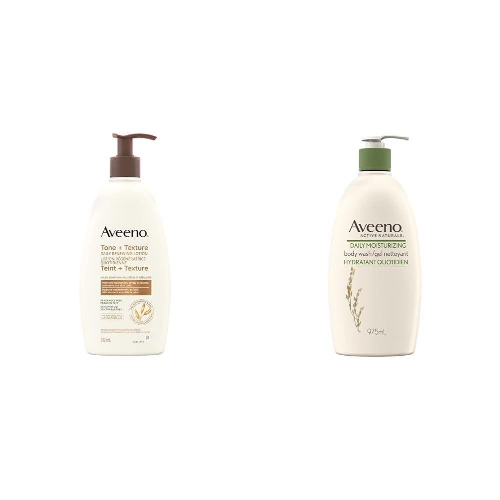 Aveeno Tone and Texture Daily Renewing Lotion, Fragrance-Free, Dry Skin & Keratosis Pilaris, Oat Extract, Vitamin B3, 532-mL Get softer, smoother, and more evenly toned skin with Aveeno Tone and Texture Daily Renewing Lotion. This body lotion contains 4% natural PHA, Pro-Vitamin B3, and prebiotic oat to moisturize all day long while smoothing rough skin. Reveal softer, smoother skin after just one use, and more even skin tone in just one week. The fragrance-free renewing body lotion is non-greasy, non-comedogenic, and paraben-free. For skin tone and texture improvement, apply Aveeno Tone and Texture Daily Renewing Lotion daily. Ensure skin is clean upon application. This body cream is suitable as part of your daily skin care routine. Skin will appear smoother and softer after a single use and skin tone will appear more even after only one week. Aveeno Tone and Texture Daily Renewing Lotion is from a brand recommended by dermatologists for 70 years. Clinically proven to help bumpy skin, including keratosis pilaris, the exfoliating and nourishing lotion is formulated with 4% natural PHA, Pro-Vitamin B3, and prebiotic oat to moisturize dry skin all day long and help remove built-up skin. This product is available in a 532 mL bottle of body lotion. Aveeno Daily Moisturizing Body Wash with Pump, Colloidal Oatmeal, Women's, Men's - Sensitive, Combination Skin - Hydrating, Soap-Free Body Scrub, 975 mL Aveeno Daily Moisturizing Body Wash, 975ml, reveals softer, smoother feeling skin for a healthier feel after you wash. This cleansing formula replenishes your skin’s natural moisture barrier with a combination of Active Naturals Colloidal Oatmeal, natural oils, and emollients, revealing beautiful, healthier-looking skin. This formula with natural colloidal oatmeal soothes skin and locks in moisture for softer skin. What’s more, this breakthrough formula is soap-free, dye-free, and gentle enough for sensitive skin. It is also suitable to other skin types, including dry, oily or combination skin as well as acne-prone skin. From a Dermatologist-recommended brand and lightly scented. Try this gentle shower gel today. This body wash for women and men comes in a bottle with a pump and contains an economic 975ml of product. To use, pump product into hands while showering. Then, create a lather in hands. Finally, lather on body and rinse clean. Get healthier looking skin with Aveeno.Product 2: This breakthrough formula from Aveeno is soap-free, dye-free, and gentle enough for sensitive skin. This body wash will retain moisture to reveal softer, smoother-looking skin with its triple oat complex. Product 2: For more radiant looking skin, use Aveeno Daily Moisturizing Body Wash. This body wash cleanses and helps replenish skin's natural moisture. This product comes in a 975-millilitre bottle and will boost your radiance. Product 1: For all-over skin soothing improvement, apply Aveeno Tone and Texture Renewing Lotion daily. To use, apply to clean skin as part of your daily skin care routine. Skin will appear smoother, softer after only one use. Product 1: The Aveeno Tone and Texture Daily Renewing Lotion contains 4% natural PHA, Pro-Vitamin B3, and prebiotic oat to moisturize all day long while smoothing rough skin. The fragrance-free renewing body lotion is non-greasy, non-comedogenic, and paraben-free. Product 1: Aveeno Tone and Texture Daily Renewing Lotion makes skin softer, smoother, and more evenly toned. This body moisturizer gently exfoliates and hydrates sensitive skin while helping smooth dry skin and improve uneven tone. Product 1: Gently exfoliate, hydrate, and smooth sensitive skin with Aveeno Tone and Texture Daily Renewing Lotion. Reveal a more even skin tone with this non-greasy lotion. This product is available in a 532 mL bottle of lotion.