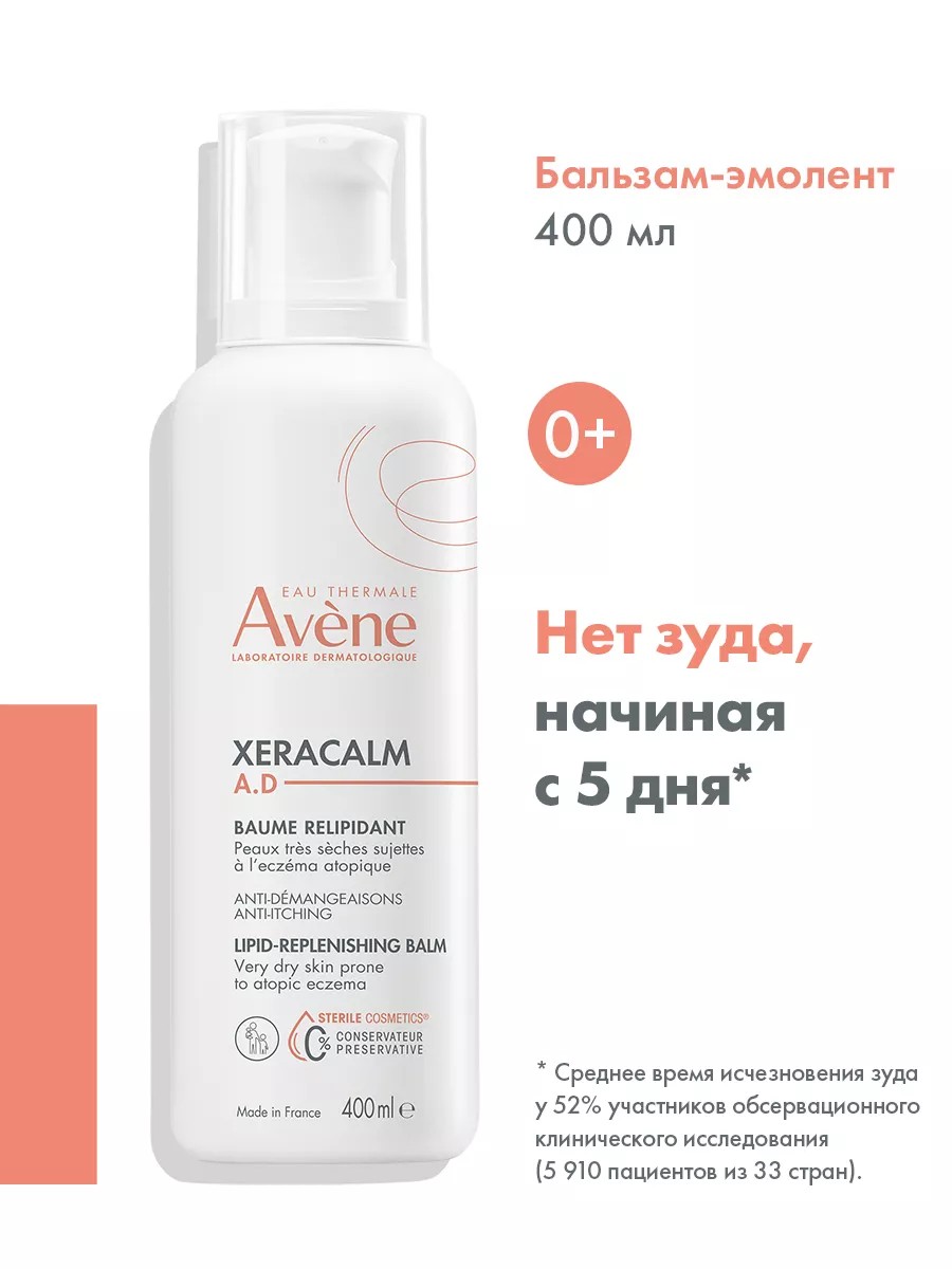 Бальзам-эмолент Avene XeraCalm AD Авен Ксеракалм А. Д. для атопичной и выраженно сухой кожи, склонной к покраснениям и зуду (вызванного сухостью). Полное исчезновение зуда за 5 дней. Снижает частоту и интенсивность обострений, отсутствие вспышек атопического дерматита через 3 месяца*. Увлажняет, восстанавливает защитный барьер кожи.