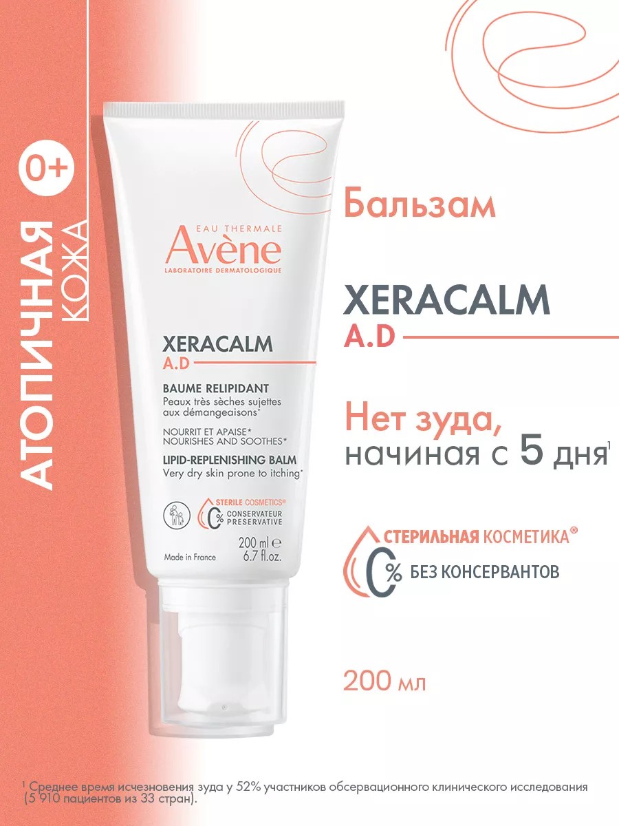 ВНИМАНИЕ! Новые партии бальзама, идут с обновленным дизайном флакона! Липидо-восполняющий бальзам для сухой атопичной кожи, для лица и тела Ксеракалм АД "XeraCalm A.D.", 200 мл. Бальзам-эмолент Avene XeraCalm AD для атопичной и выраженно сухой кожи, склонной к покраснениям и зуду (вызванного сухостью). Полное исчезновение зуда за 5 дней. Снижает частоту и интенсивность обострений, отсутствие вспышек атопического дерматита через 3 месяца. Увлажняет, восстанавливает защитный барьер кожи. Формула Авен Ксеракалм АД содержит: Комплекс I-modulia – результат 12-ти летних научных разработок – действует от зуда на коже, вызванного сухостью, а также успокаивает раздражение и покраснения, вызванные гиперреактивностью кожи. СER-OMEGA – липидовосполняющий комплекс, подобный естественным липидам кожи, восстанавливает, питает и укрепляет защитную пленку кожи, обеспечивая лучшую сопротивляемость агрессивным факторам внешней среды. Термальная вода Avene в составе смягчает и снимает раздражение. Преимущества: Запатентованный активный ингредиент от зуда на коже. Бальзам-эмолент для детей и взрослых. Интенсивно питает сухую кожу. Восстанавливает кожу. Создает на коже защитный барьер. Убирает покраснения и успокаивает кожу. Не содержит консерванты. Формула с использованием минимума ингредиентов для максимальной безопасности и переносимости. Запатентованная стерильная упаковка. Для тела, для рук и лица младенцев, детей и взрослых. Бальзам-крем для очень сухой кожи лица, а также атопичной кожи, склонной к покраснениям и зуду. Наносить один или два раза в день на сухие участки лица и /или тела после очищения кожи очищающим маслом XeraCalm A.D. Эмолент для детей, крем для очень сухой кожи лица. Бальзам, детский, от покраснений, для тела, авен ксеракалм, для атопичной, обезвоженной, от зуда, с эмолентами, для рук. Бальзам для выраженно сухой и атопичной кожи, склонной к покраснениям и зуду. Для младенцев, детей и взрослых. Французская косметика, Авен, Авене, Avene.