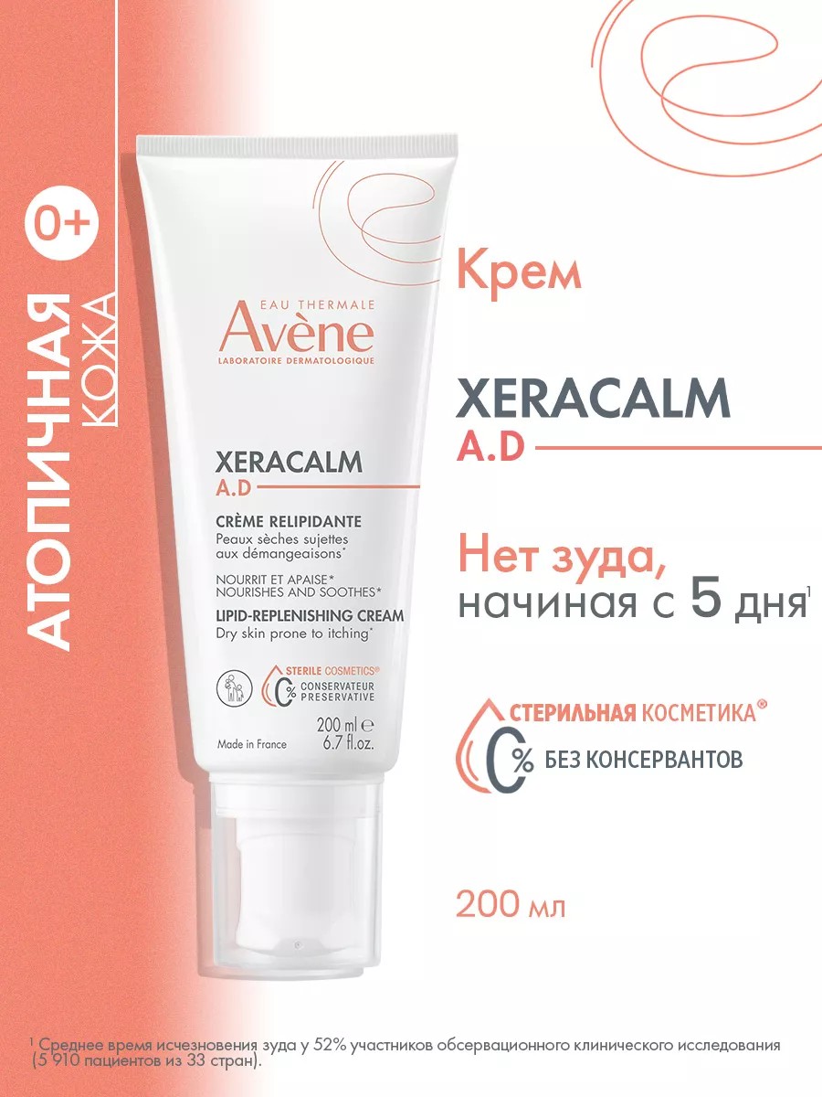 ATTENTION! New batches of cream come with an updated bottle design! Lipid-replenishing cream for dry atopic skin, for face and body, for children and adults XeraCalm AD "XeraCalm A.D." Creme relipidante, 200 ml. Avene XeraCalm AD emollient cream for atopic and moderately dry skin prone to redness and itching (caused by dryness). Itching disappears in 5 days. Reduces the frequency and intensity of exacerbations, eliminating flare-ups of atopic dermatitis after 3 months. Moisturizes, restores the skin's protective barrier. Avène Xeracalm AD formula uses a minimum of ingredients for maximum safety and tolerability: The I-modulia complex, the result of 12 years of scientific research, relieves itching caused by dry skin and soothes irritation and redness caused by hyperreactivity. CER-OMEGA, a lipid-replenishing complex similar to natural skin lipids, restores, nourishes, and strengthens the skin's protective film, providing better resistance to aggressive environmental factors. Avène thermal spring water softens and relieves irritation. A patented active ingredient against itching. Benefits: A facial cream for very dry skin and atopic skin. Intensively nourishes and restores the skin. Creates a protective barrier on the skin. Recommended for redness and itching. Gently soothes the skin. Patented sterile packaging. Suitable for the body and face of babies, children, and adults. Recommended for dehydrated, sensitive skin. Apply once or twice daily to dry areas of the face and/or body after cleansing. After use, remove any excess cream from the dispenser and close the lid. Baby, anti-redness, body, Avene XeraCalm, for atopic, dehydrated, anti-itch, with emollients, for hands. Emollient cream for children and adults, for redness and itching on the face and body, for atopic skin. For babies, children and adults, cream for atopic dermatitis, cream for atopic skin. French cosmetics, Avene, Avene, Avene.