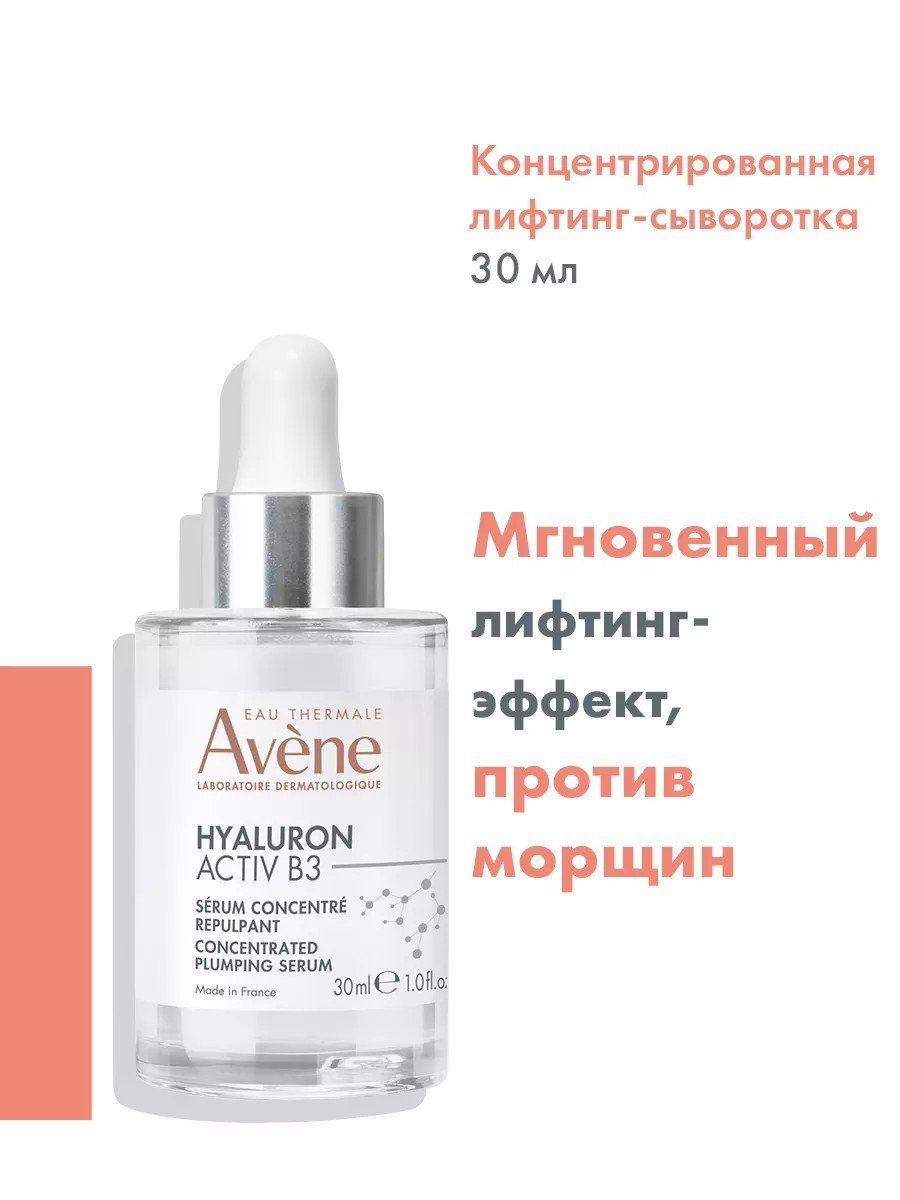 Концентрированная лифтинг-сыворотка для упругости кожи HYALURON ACTIV B3, 30 мл. Мгновенный лифтинг-эффект. Разглаживает кожу, корректирует морщины. Ультралегкая нелипкая текстура. ПОКАЗАНИЯ: морщины, тонкие линии. Потеря упругости и эластичности кожи. Тусклый цвет лица. ЭКСКЛЮЗИВНАЯ ФОРМУЛА: в состав сыворотки входят 2 активных высококонцентрированных дерматологических ингредиента. НИАЦИНАМИД 6%: надолго стимулирует клеточную регенерацию, продлевая молодость кожи. ГИАЛУРОНОВАЯ КИСЛОТА 1,5%: чистая, натурального происхождения. 2 вида: высоко- и низкомолекулярная. Увлажняет, разглаживает кожу и восполняет утерянный объём. РЕЗУЛЬТАТ: 84% женщин отметили мгновенный подтягивающий лифтинг-эффект после нанесения. Через 4 часа кожа становится более плотной и эластичной. 80% женщин отметили, что через 15 дней кожа более упругая и обновлённая. Французская косметика, Авен, Авене, Avene.