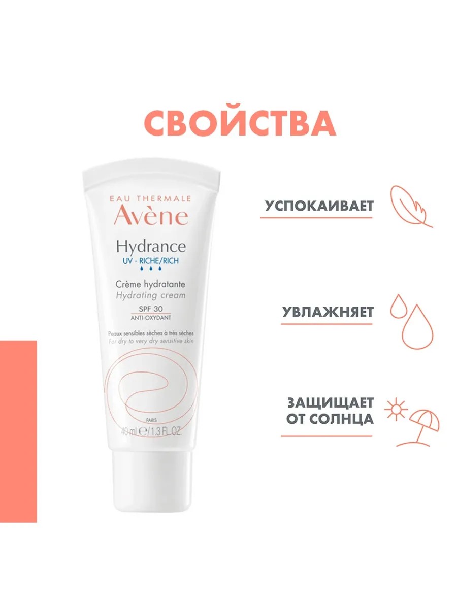Avene HYDRANCE Крем увлажняющий RICH SPF 30, 40 мл - ежедневное увлажнение, питание и защита от солнца для сухой кожи.