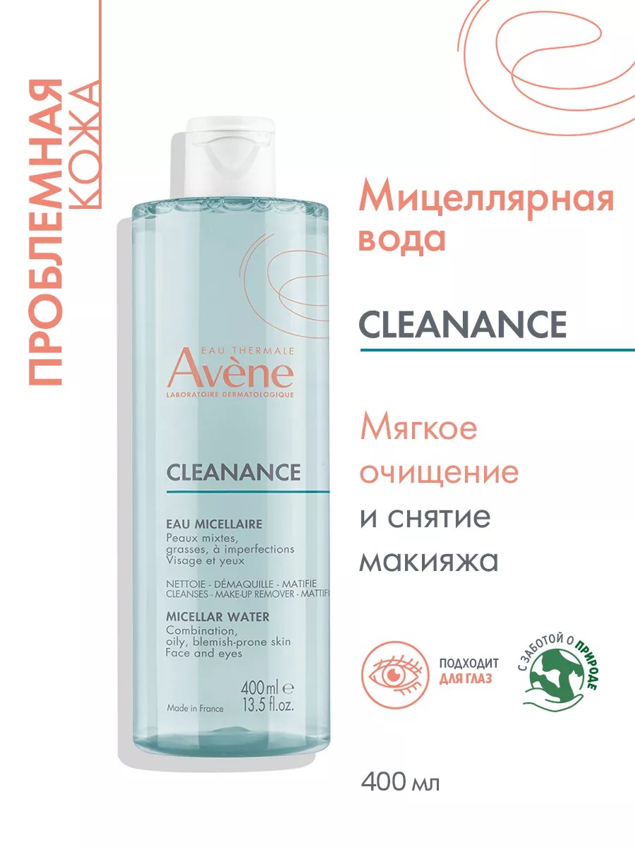Мицеллярная вода для жирной и проблемной кожи, для удаления снятия макияжа Клинанс CLEANANCE, 400 мл. Мицеллярная вода для снятия макияжа Cleanance очищает кожу, освежает и матирует, сокращая жирный блеск. Она бережно удаляет загрязнения с кожи, которые забивают поры, в том числе макияж, благодаря мягким очищающим компонентам. Comedoclastin – регулирует чрезмерную выработку cебума, спасая кожу от появления жирного блеска. Мицеллярная вода для жирной кожи Авэн Клинанс содержит термальную воду Avene, которая обладает успокаивающими и противовоспалительными свойствами. Преимущества: Мягко очищает лицо, включая зону вокруг глаз. Удаляет даже водостойкий макияж. Делает кожу чистой и гладкой. Защищает от акне и прыщей на лице. Матирует кожу от жирного блеска. Сохраняет естественный pH кожи. Высокая офтальмологическая переносимость. Имеет приятный аромат. Подходит для подростков и взрослых. Рекомендована для жирной и проблемной кожи лица, включая кожу вокруг глаз. Наносить на ватный диск и протирать лицо и глаза утром и/или вечером. При необходимости затем распылить Термальную воду Avene. Не требует смывания. от акне, прыщей, проблемной кожи, от жиного блеска, с дозатором. Французская косметика, Авен, Авене, Avene.