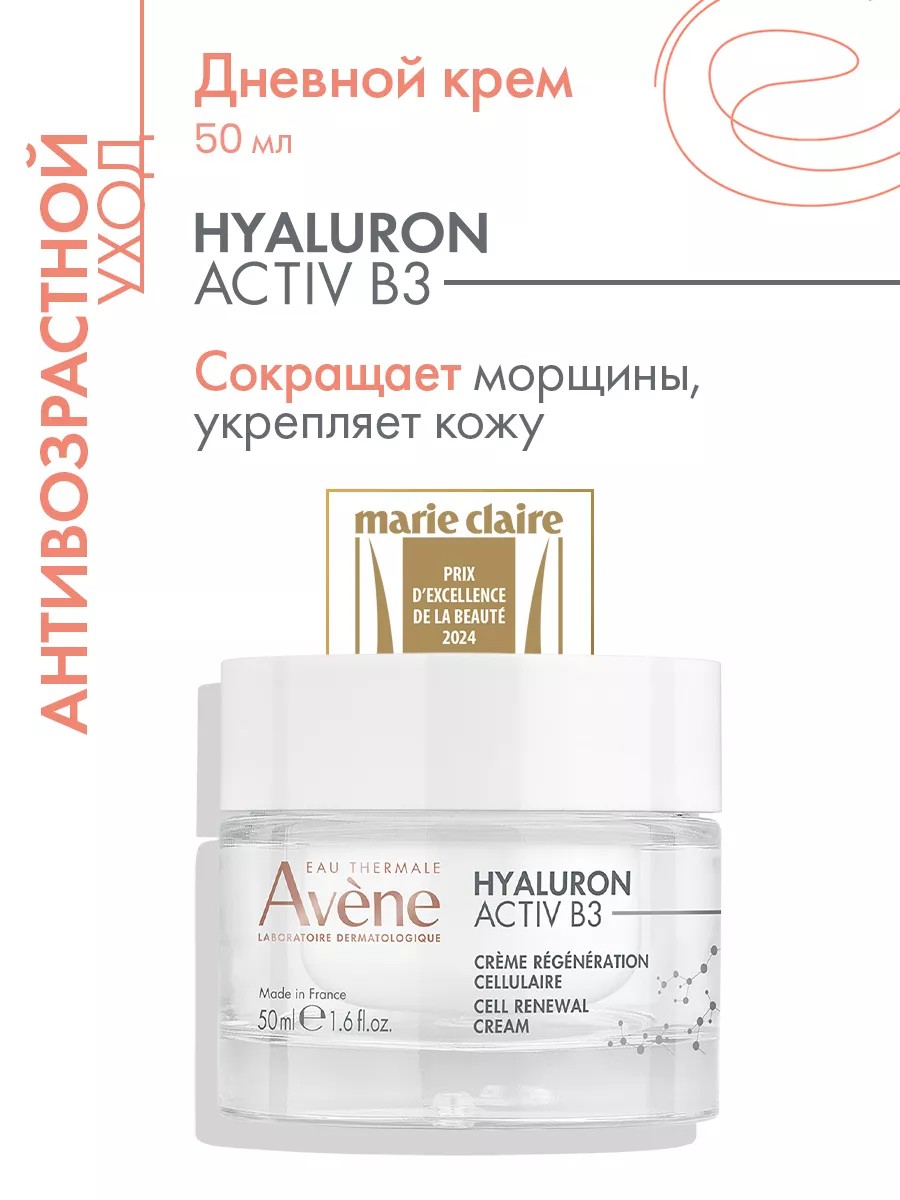 Complex regenerating day cream HYALURON ACTIV B3, 50 ml. After 15 days, the skin is more elastic and renewed. Corrects wrinkles, improves skin elasticity. INDICATIONS: wrinkles, fine lines. Loss of skin firmness and elasticity. Dull complexion. EXCLUSIVE FORMULA: the cream contains 2 active anti-aging dermatological ingredients. NIACINAMIDE 6%: long-lastingly stimulates cellular regeneration, prolonging the youthfulness of the skin. HYALURONIC ACID: pure, natural origin. 2 types: high- and low-molecular. Moisturizes, smoothes the skin and restores lost volume. Eco-friendly approach: replaceable block - ecorefill. RESULT: from the first use, the skin becomes smooth and radiant. French cosmetics, Avène, Avene.