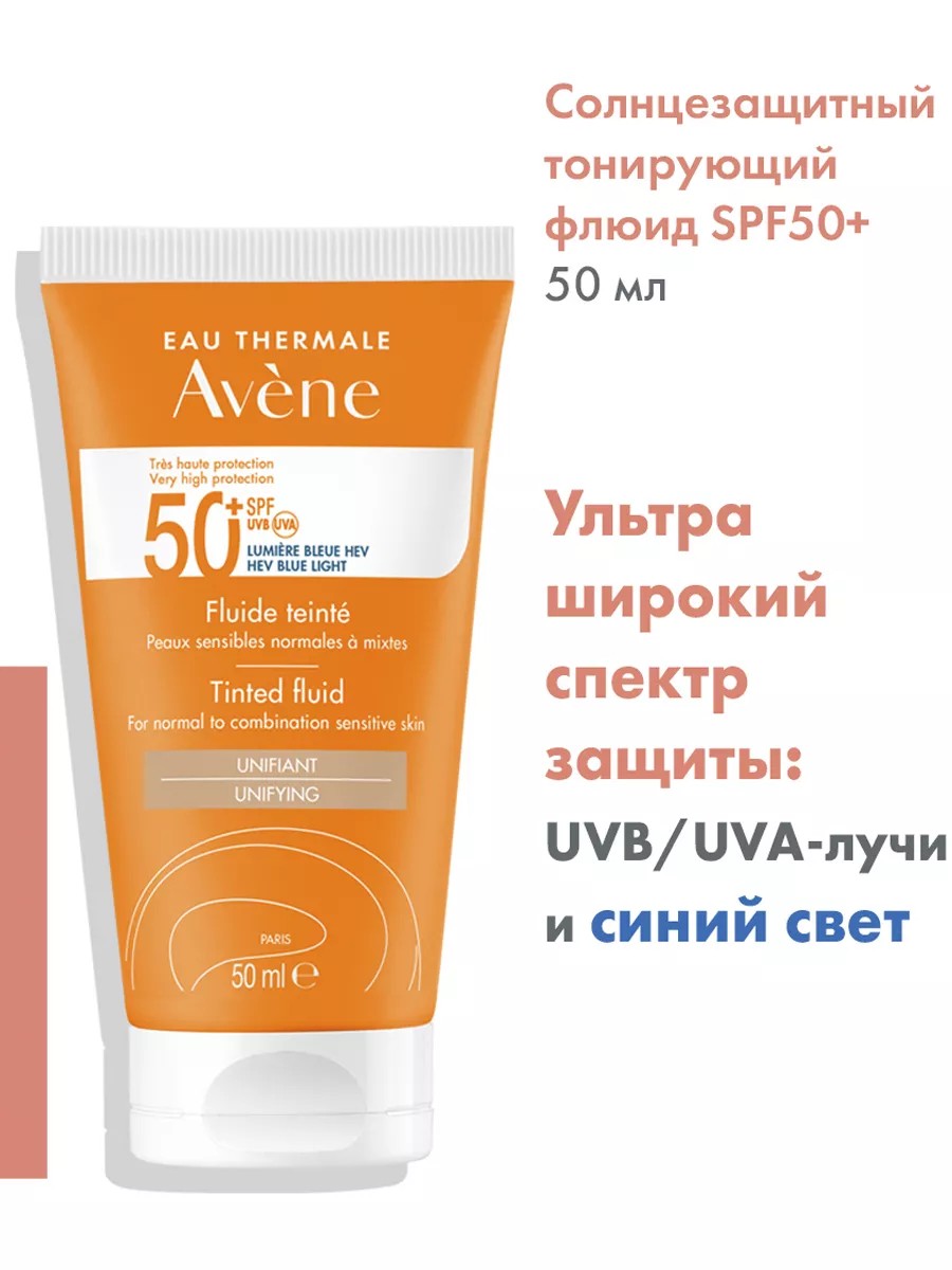 Солнцезащитный крем флюид тонирующий UNIFYING Avene Solaire Tinted Fluid SPF 50+. Очень высокая степень защиты для нормальной и комбинированной чувствительной кожи: -ультраширокий спектр защиты - UVA-UVB + HEV (синий свет)-SKIN PROTECT (ЗАЩИТА КОЖИ): Запатентованный комплекс TriASorBТМ - для защиты от ультра-широкого спектра излучения: UVA - UVB - Высокоэнергетический видимый синий свет (HEV) -OCEAN RESPECT (ЗАЩИТА ОКЕАНА) - на 63% меньше пластика. Формула с минимальным негативным воздействием на окружающую среду. Ультралегкий солнцезащитный тонирующий флюид для лица и шеи. Подходит для большинства оттенков кожи, выравнивая несовершенный тон. Водостойкий. Не щиплет глаза. Содержит тонирующий фильтр против синего света. Разработано с целью минимизации риска возникновения аллергических реакций. Некомедогенно. Солнцезащитный крем, солнцезащитный крем для лица, солнцезащитный крем для тела, солнцезащитный крем spf 50, защита от солнца, крем солнцезащитный, крем от солнца, защитный крем от солнца, защита от солнца для лица, крем от загара солнцезащитный. Французская косметика, Авен, Авене, Avene.