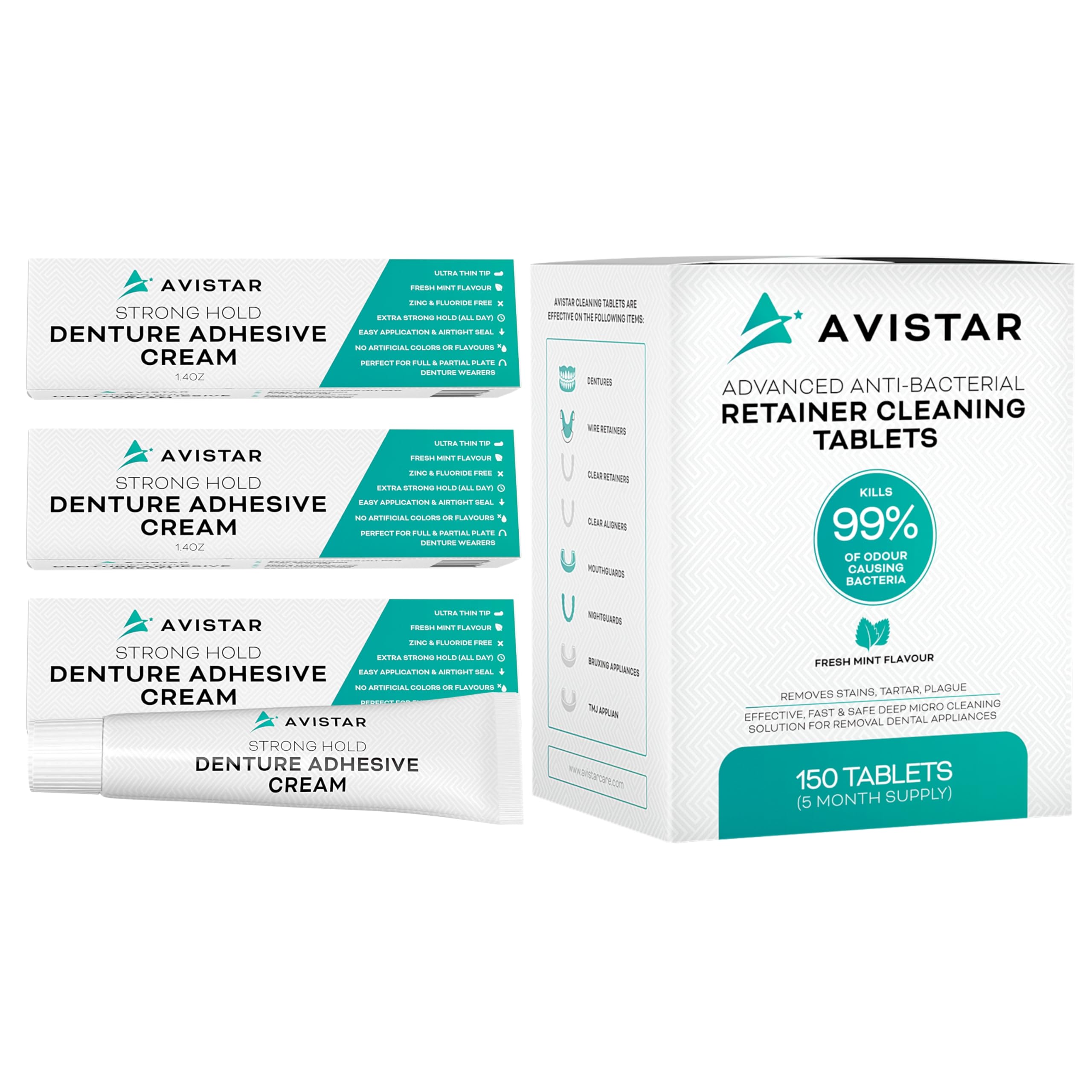 Avistar Extra Strong Denture Adhesive Cream (3 Pack 4.2 Fl Oz) and Retainer Cleaning Tablets (150 Mint Flavor 5 Months Supply)