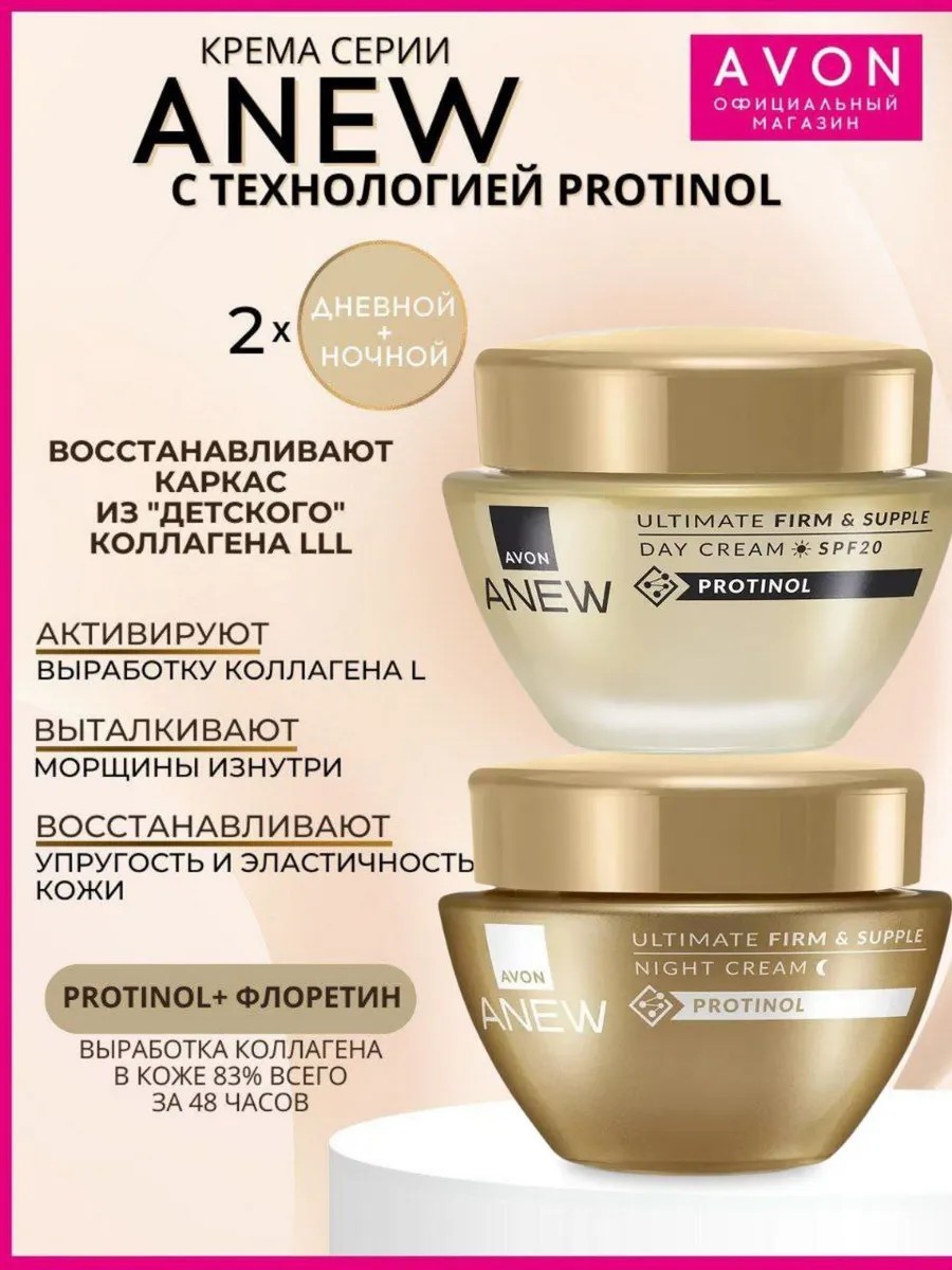 Дневной лифтинг-крем для лица с защитой от солнца SPF 25 стимулирует выработку двух типов коллагена, сокращает морщины и моделирует контуры лица, возвращает коже упругость. Подходит для возрастной кожи, омолаживая ее. Средства серии Anew от AVON с технологией Protinol содержат сыворотку Protinol, которая восстанавливает каркас из "детского" коллагена III и активирует выработку коллагена I. Вместе они создают матрицу, которая выталкивает морщины изнутри и восстанавливает упругость и эластичность кожи. 8 из 10 женщин подтвердили заметный лифтинг-эффект уже через 2 дня.Серия разработана специально для борьбы с провисанием кожи и потерей контура. Технология Protinol + Аргиниин увеличивает выработку эластина кожи на + 53% всего за 48 часов! Ночной антивозрастной крем для лица Anew с технологией Protinol by Avon также содержит сыворотку Protinol. Серия разработана специально для возраста 55+.