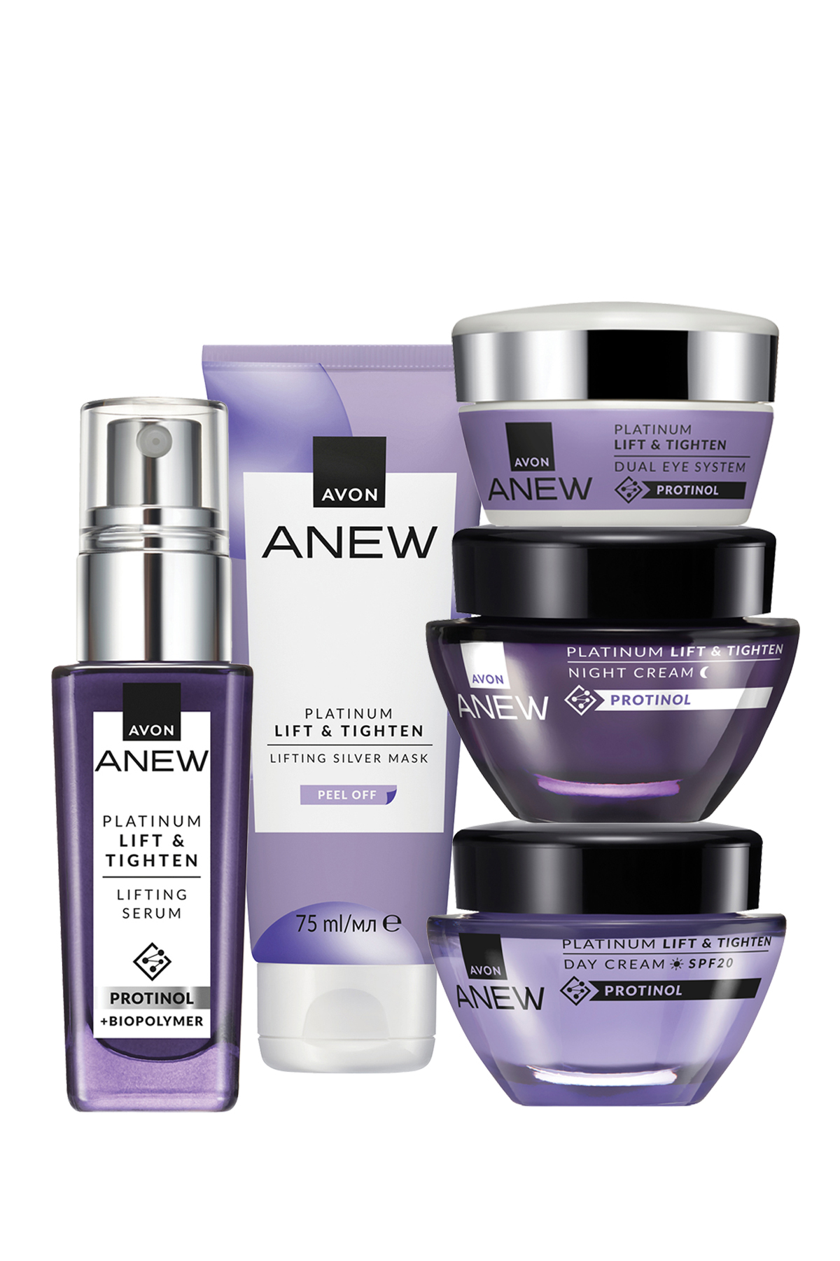 Package Content: - Anew Platinum Lift Tighten Night Cream 50 Ml. - Anew Platinum Lift Tighten Lifting Serum 30 Ml. - Anew Platinum Lift Tighten Dual Eye System 20 Ml. - Anew Platinum Lift Tighten Day Cream SPF20 50 Ml. - Anew Platinum Peel-Off Face Mask 75 Ml.