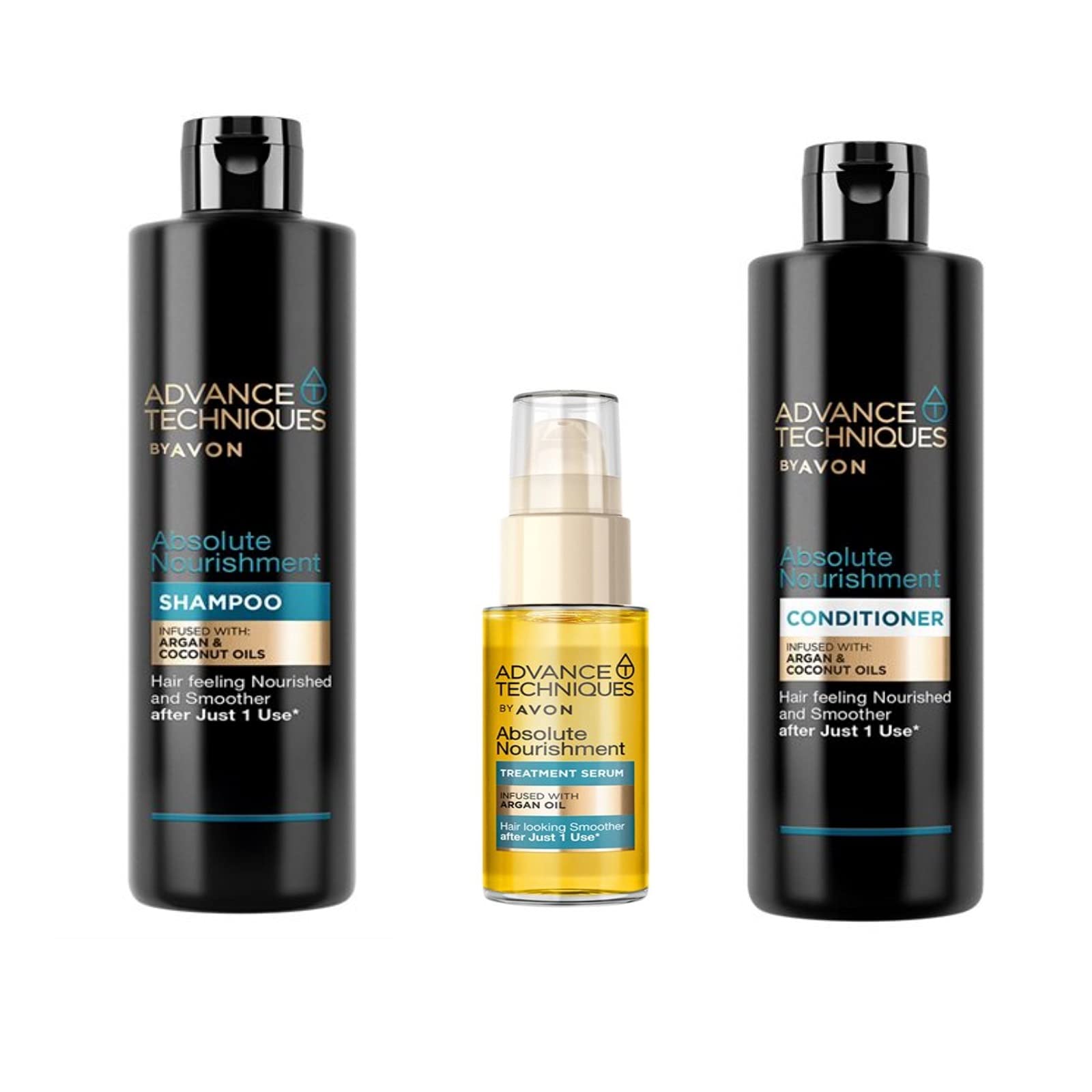 Avon Advance Techniques 360 Nourishment Set with Moroccan argan oil, leave-in treatment, shampoo and conditioner.