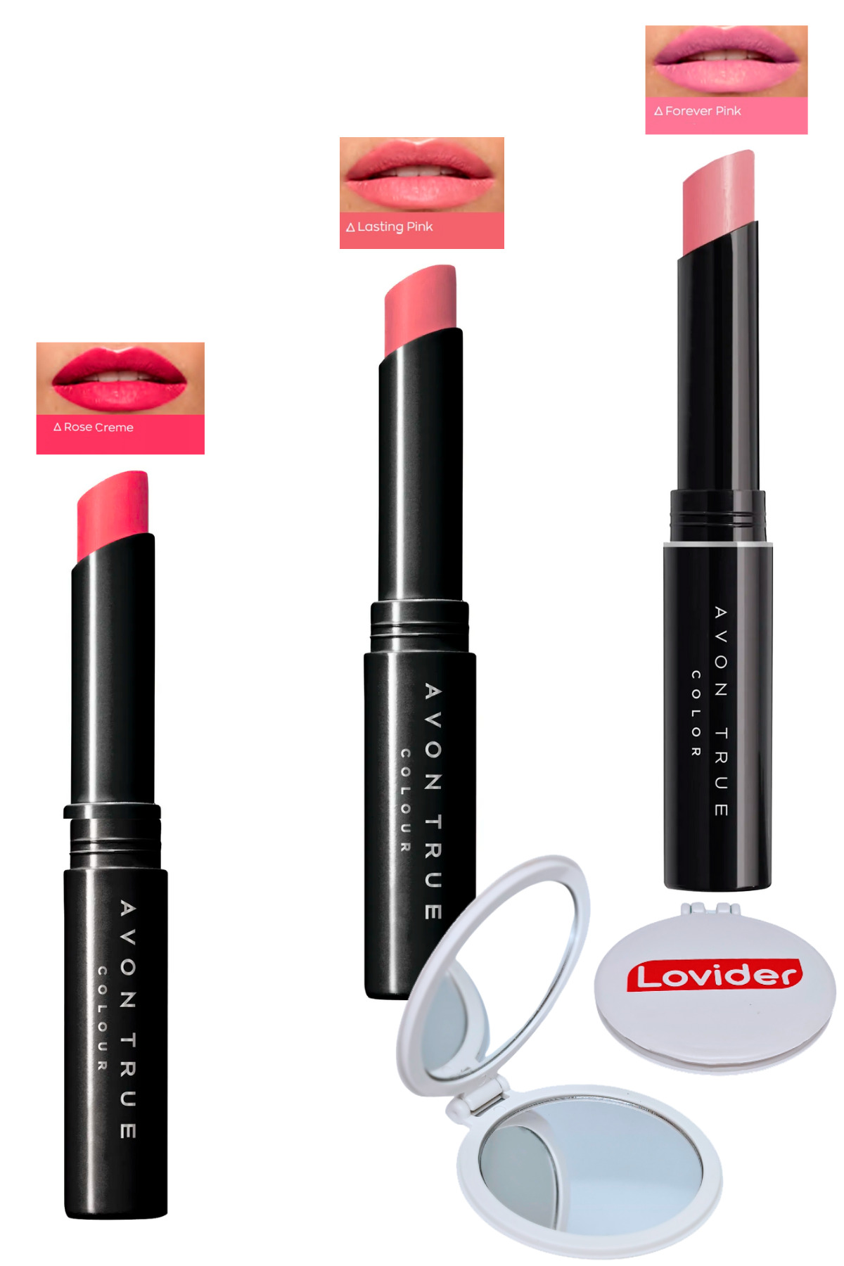 Avon Beauty 3-Pack Lipstick - Rose Creme + Lasting Pink + Forever Pink + Lovider Pocket Mirror