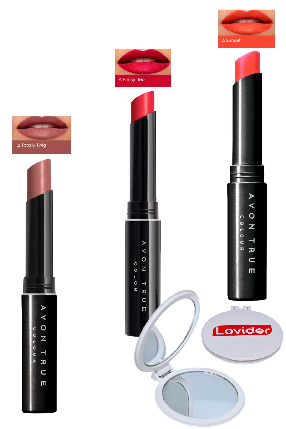 Avon Beauty 3-Pack Lipstick - Totally Twig + Frisky Red + Sunset + Lovider Pocket Mirror