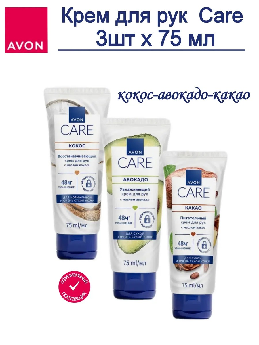 Кремы для рук Avon Care 3х75 мл-увлажняющий с маслом авокадо-питание с маслом какао-защита и восстановление для очень сухой кожи рук, с маслом кокоса- глубокое увлажнение и питание.