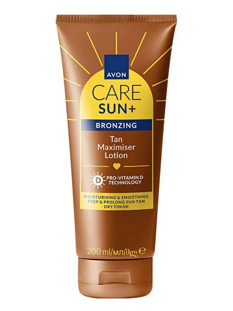 Лосьон Care Sun Bronze Эйвон с нежной фактурой не создаёт липкости тела усиливает ровный загар защищает кожу от пересыхания на солнце придает бархатистость и ровный бронзовый цвет загара подходит для всех типов кожи с бето кератином Увлажняет и питает