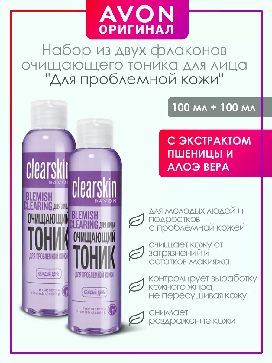 Серия Clearskin разработана экспертами Avon для молодых людей и подростков с проблемной кожей, которая склонна к частым высыпаниям. Формула с экстрактом пшеницы и алоэ вера контролирует жировые выделения кожи и удаляет их излишки. После применения кожа остается чистой и свежей. Подходит для проблемной кожи.