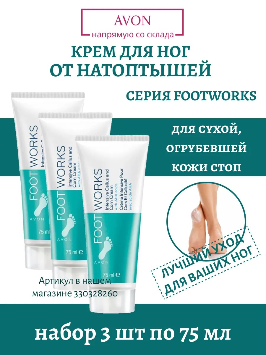 | Комплектация | Крем от натоптышей, 75 мл - 3 шт; Крем для ног FOOTWORKS от Avon; крем для ног Эйвон |
